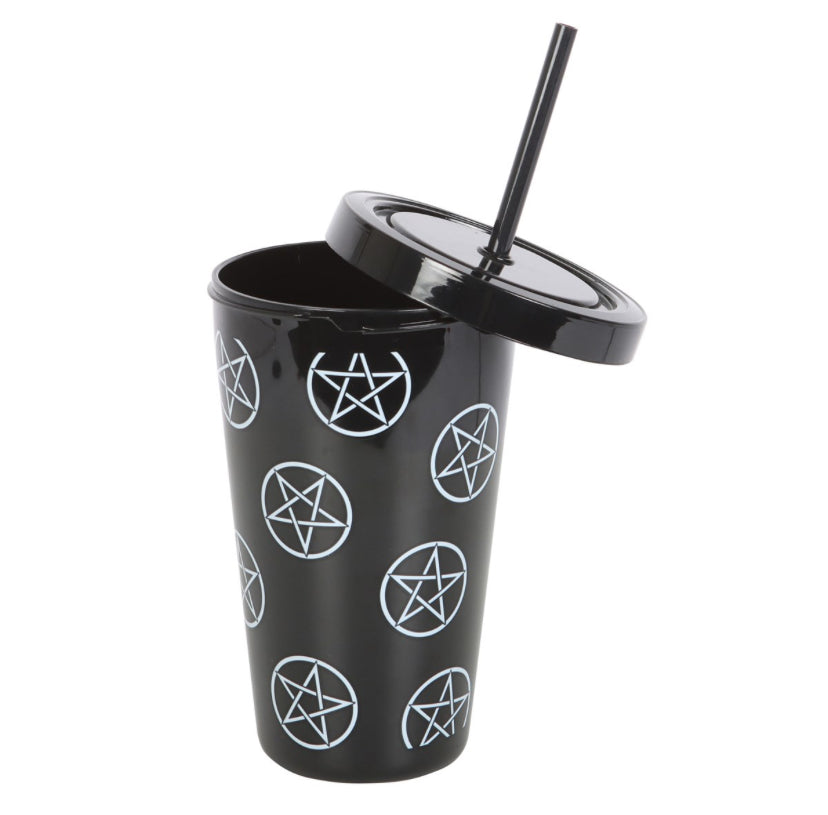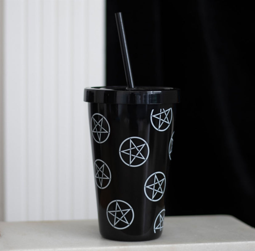This tumbler is more than a drinkware item; it's a statement piece. The bold white pentagram design set against the sleek black background creates a striking contrast, turning an everyday object into a symbol of unique style.
