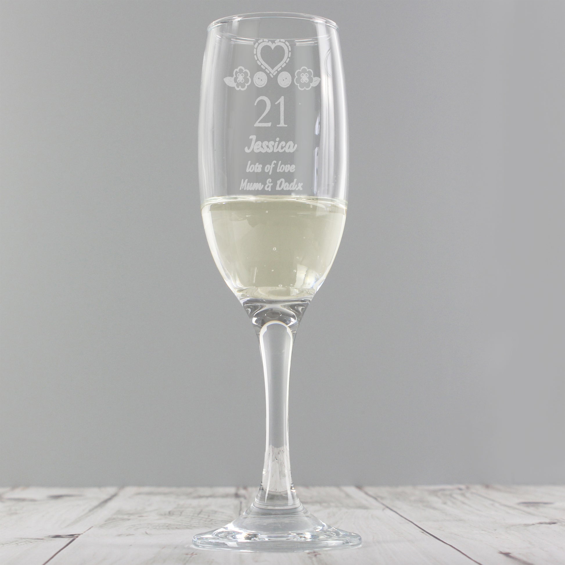 Personalise this elegant flute with an age up to 2 characters, a name up to 12 characters and with two lines of a message up to 15 characters each.