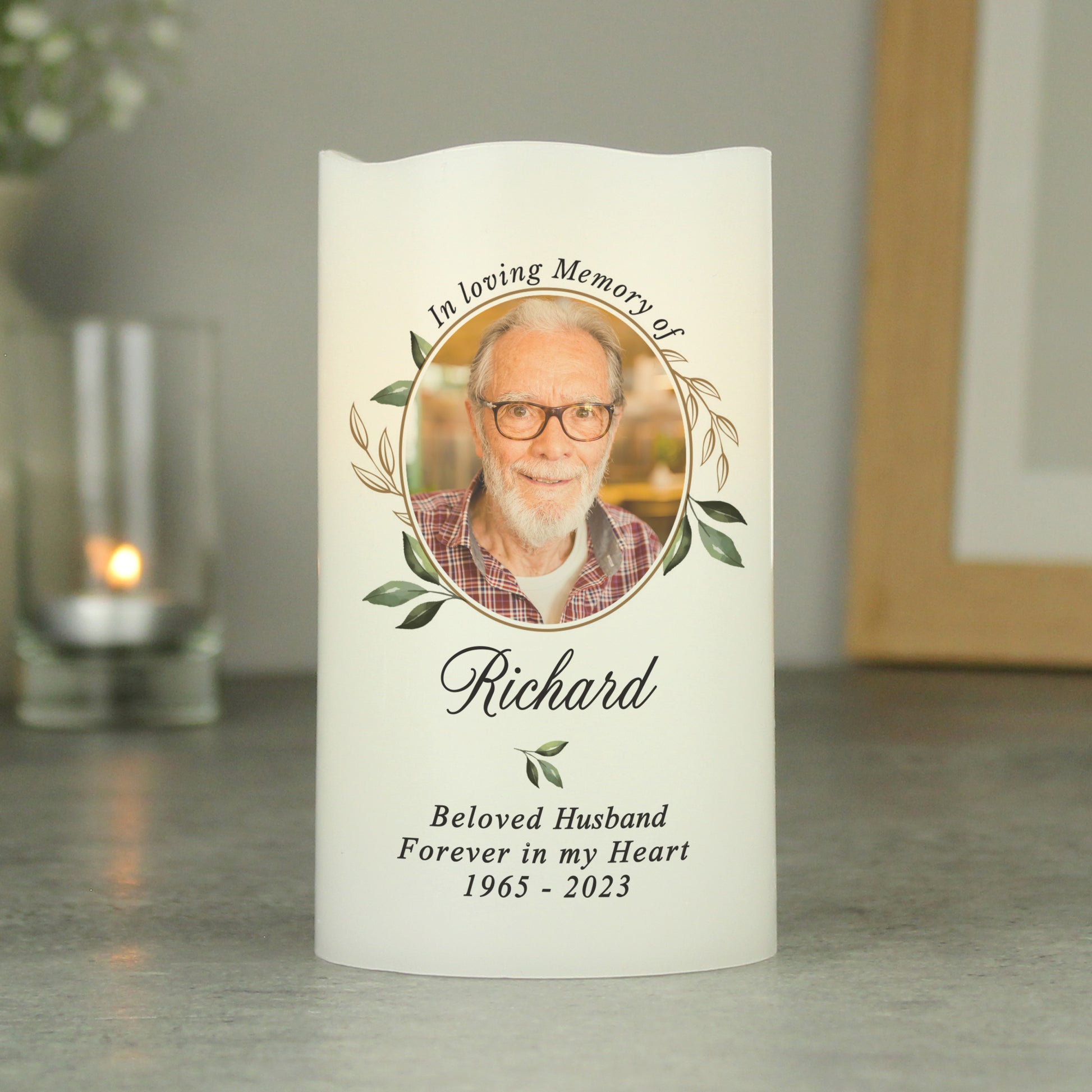 Light a candle for a loved one with this special Personalised Botanical Memorial Photo Upload LED Candle
