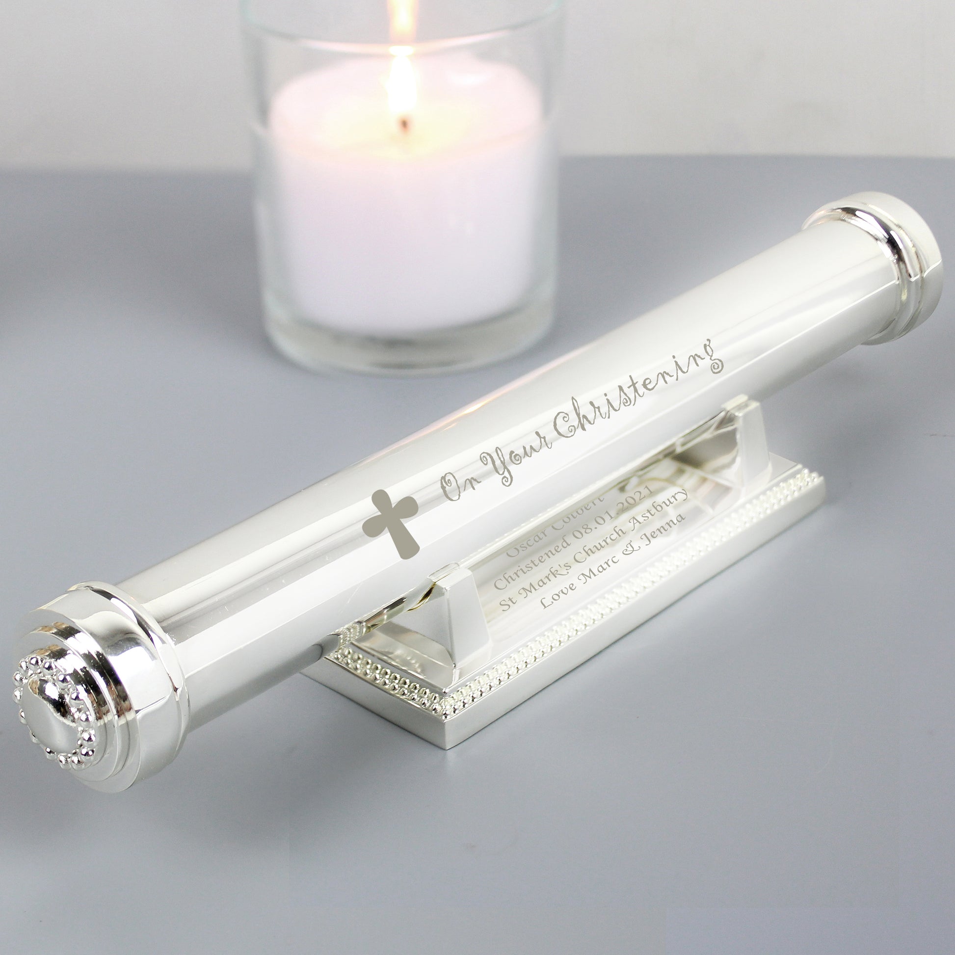 The wording 'On Your Christening' featured on the holder is fixed text.