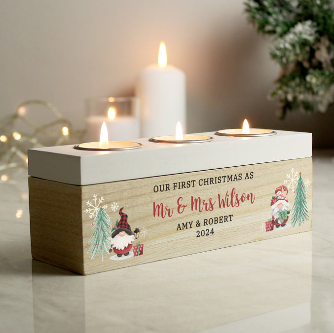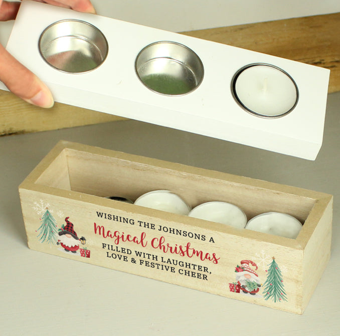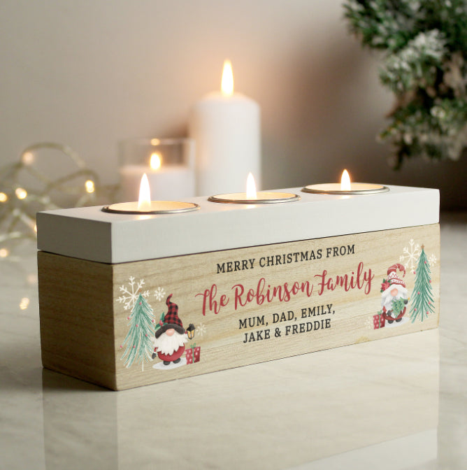 Embrace the festive spirit with our enchanting Personalised Christmas Gonk Triple Tea Light Box.