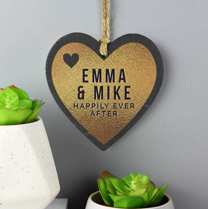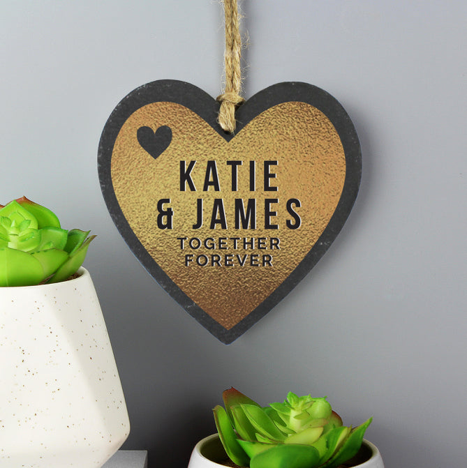 Personalise this 'Gold Heart' Printed Slate Heart Decoration with two names and a message over 2 lines of 15. Each name can be up to 15 characters long. The heart has a piece of natural, rustic string which enables this item to be hung up.