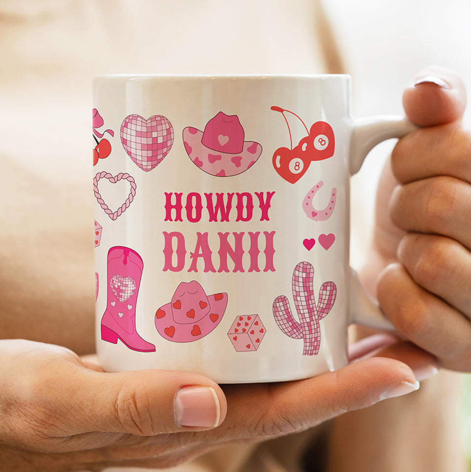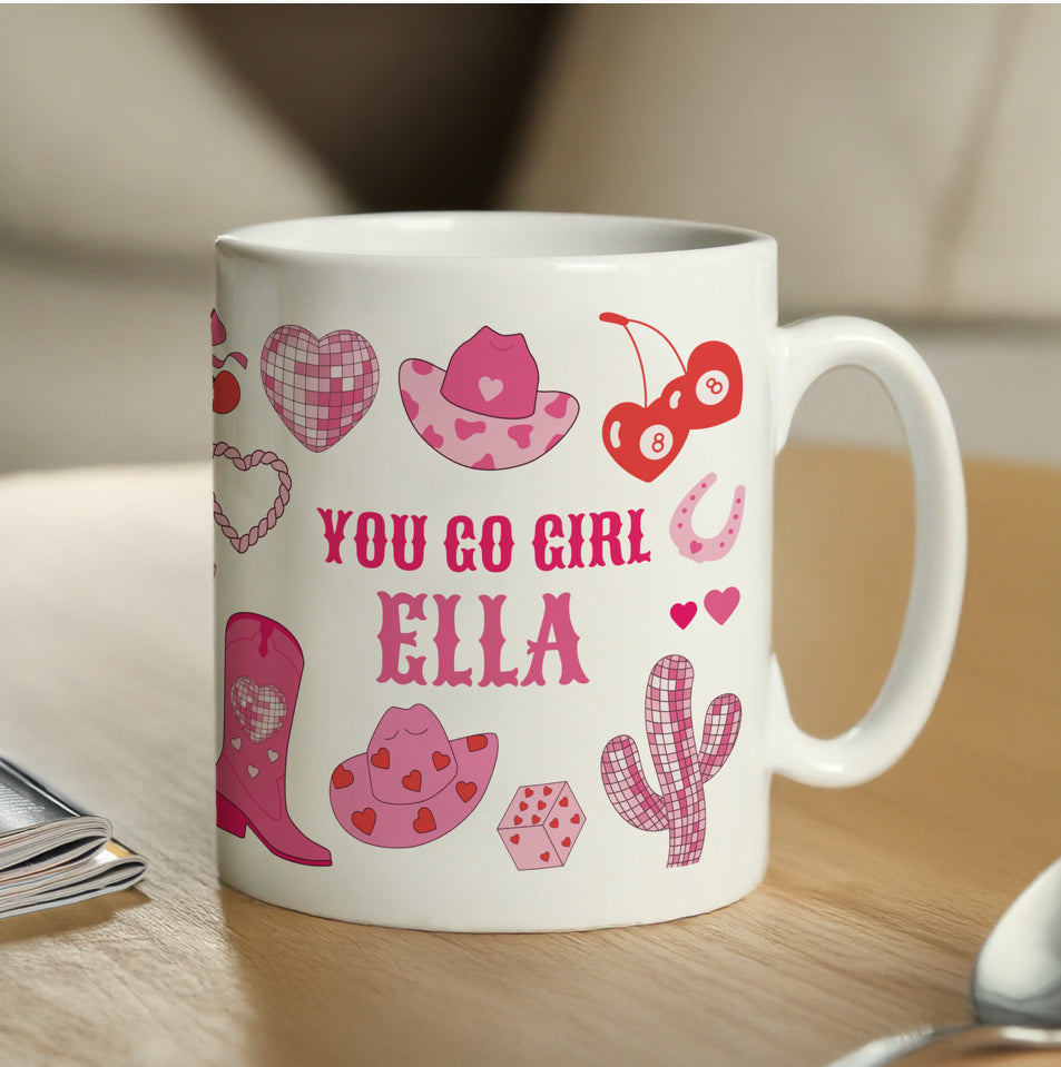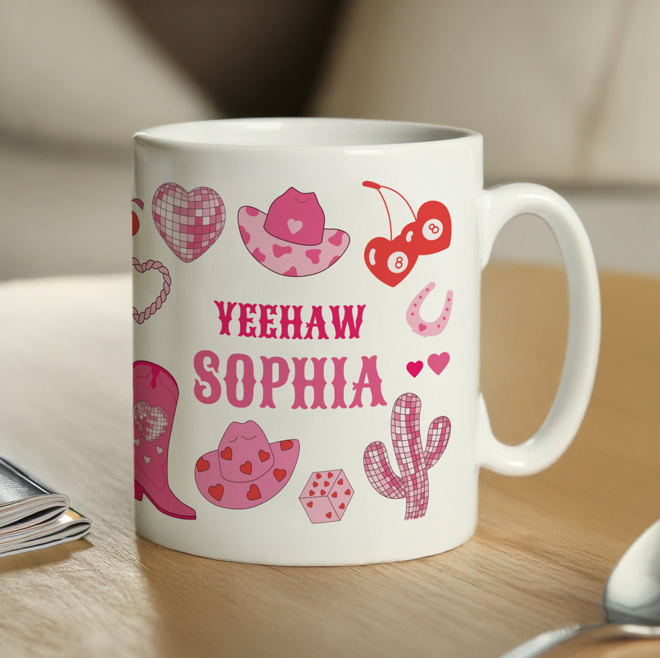 Featuring a vibrant pink design perfect for cowgirls at heart, this mug can be personalised with two lines of up to 12 characters each. Please add your personalisation to notes when at checkout