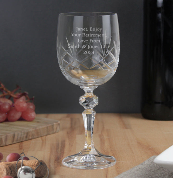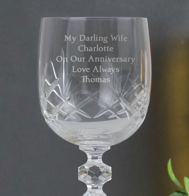 The wine glass can be engraved with any message over 5 lines and up to 20 characters per line.