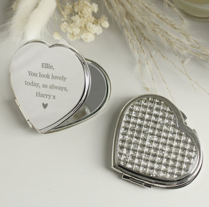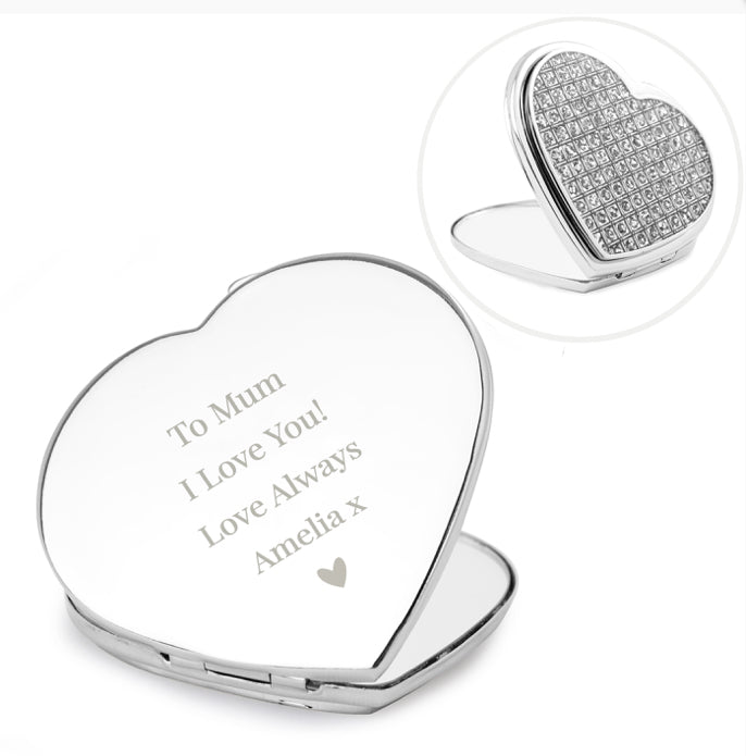 A heart shaped compact mirror with one of the exterior sides covered in a diamante effect.