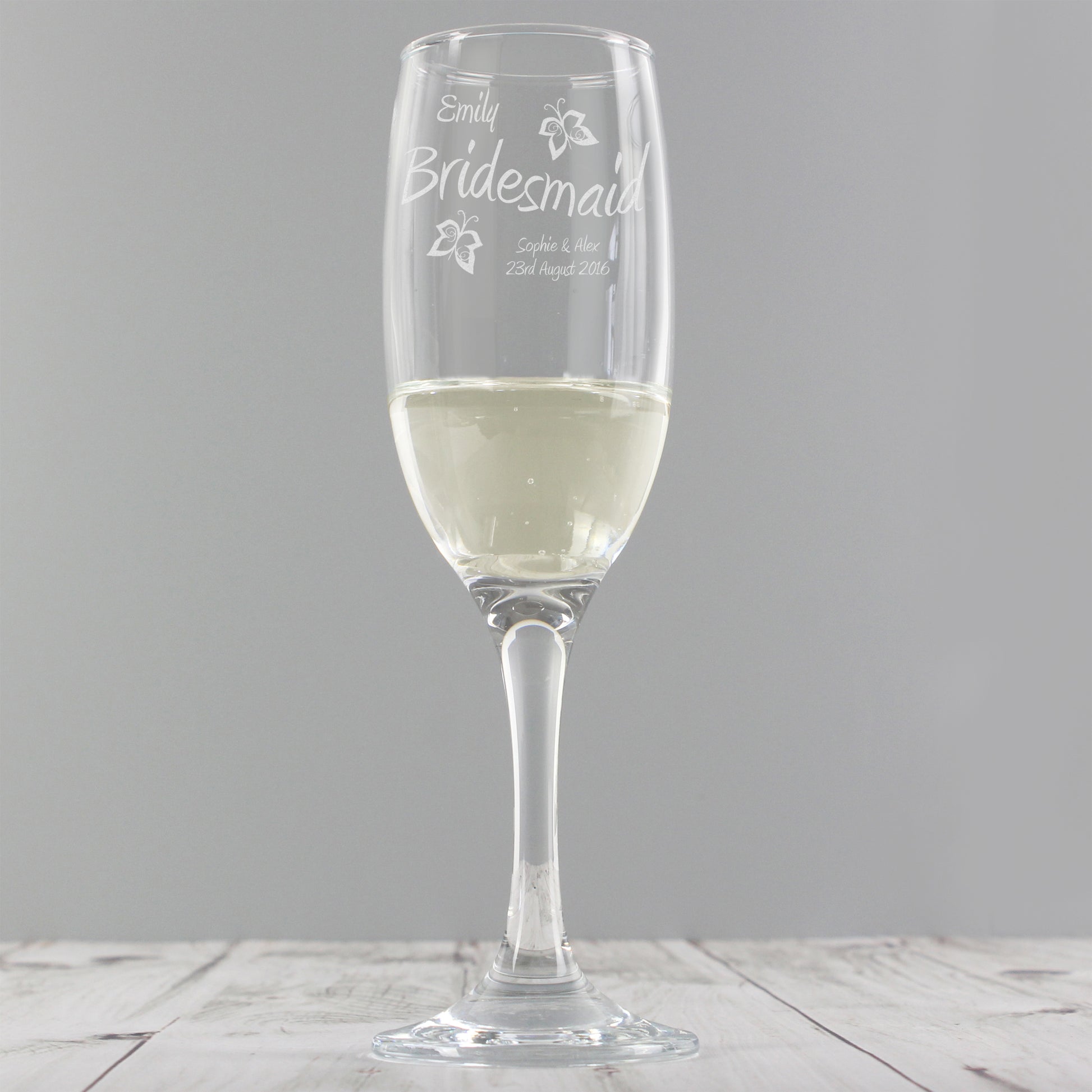 This stunning flute is beautifully laser engraved with a butterfly design. The flute is also personalised with a name, a role and couple's name and date of wedding. All the personalisation is laser engraved in an elegant font with the person's role in a pretty wave across the centre of the glass. This is a truly beautiful way to say thank you to your bridesmaids, mother's, special guests or even for yourself to keep to remember your very special day.