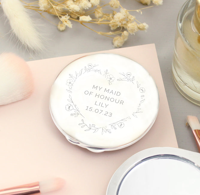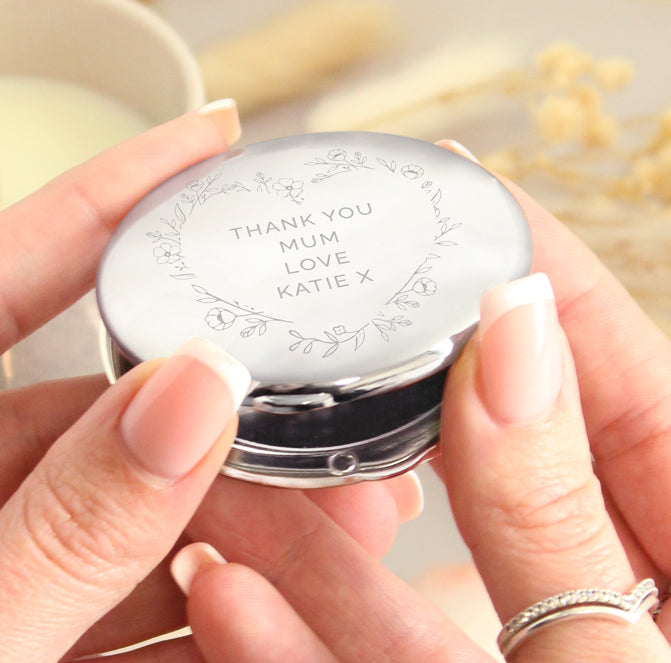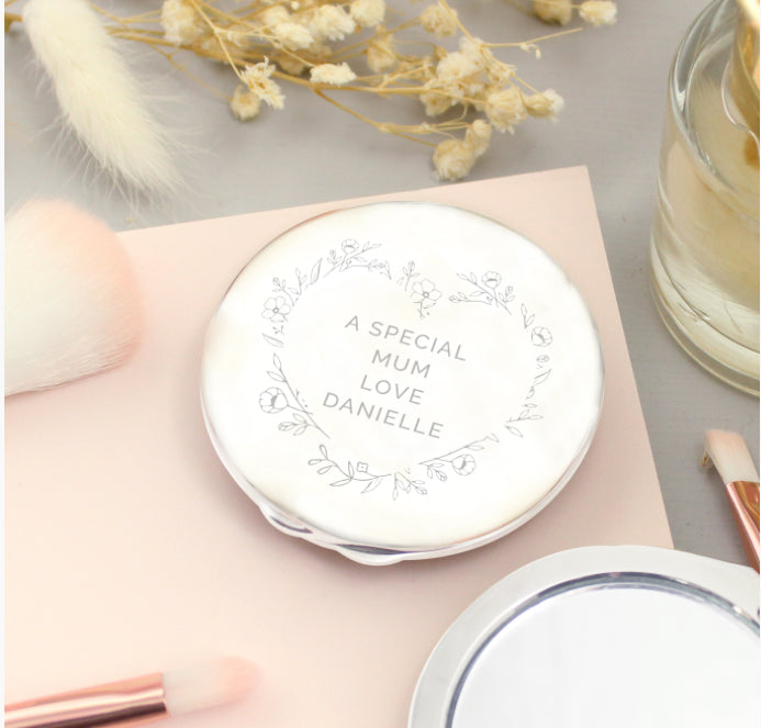 You can personalise this compact mirror with a special message, over 4 lines of 10 characters per line, to feature inside the floral heart motif.