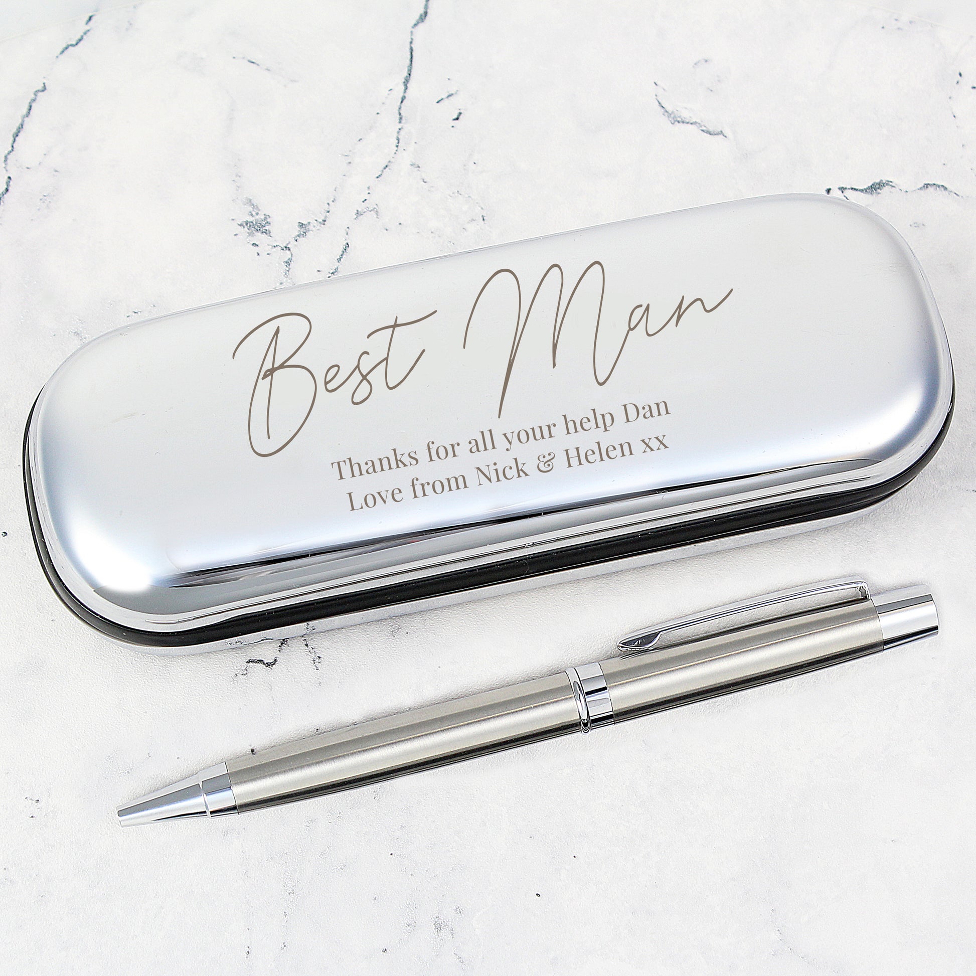 This chrome plated pen and box set includes a ball point pen and box which can be engraved with a message up to 3 lines, Line 1 (bigger text) can be personalised with up to 12 characters. Lines 2&3 can be personalised with 40 characters per line