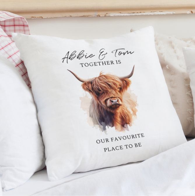 Our personalised cushion, featuring an adorable Highland cow design, is a unique gift to add that personal touch to someone's home or bedroom.