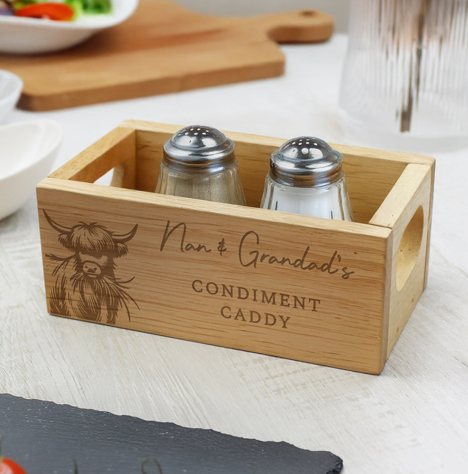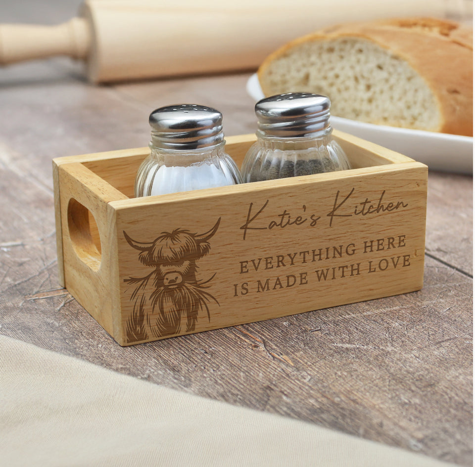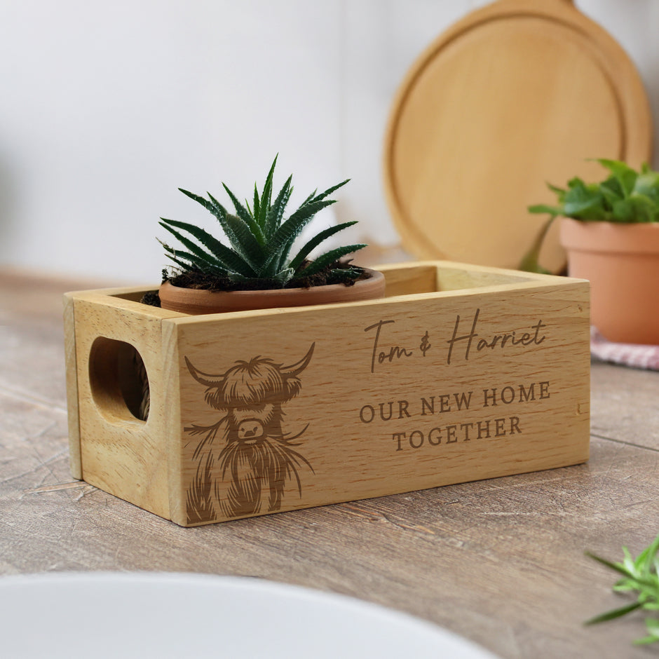 To the left side of the crate, there's a lovely engraved Highland cow design, adding a fun rustic touch that makes it extra special.