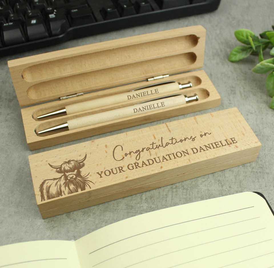 Personalised Highland Cow Wooden Pen & Pencil Set