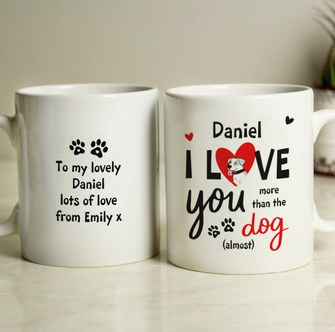 This cute personalised mug features the text "I love you more than the dog" to the front, high praise for a partner who knows how much you love your pampered pooch!