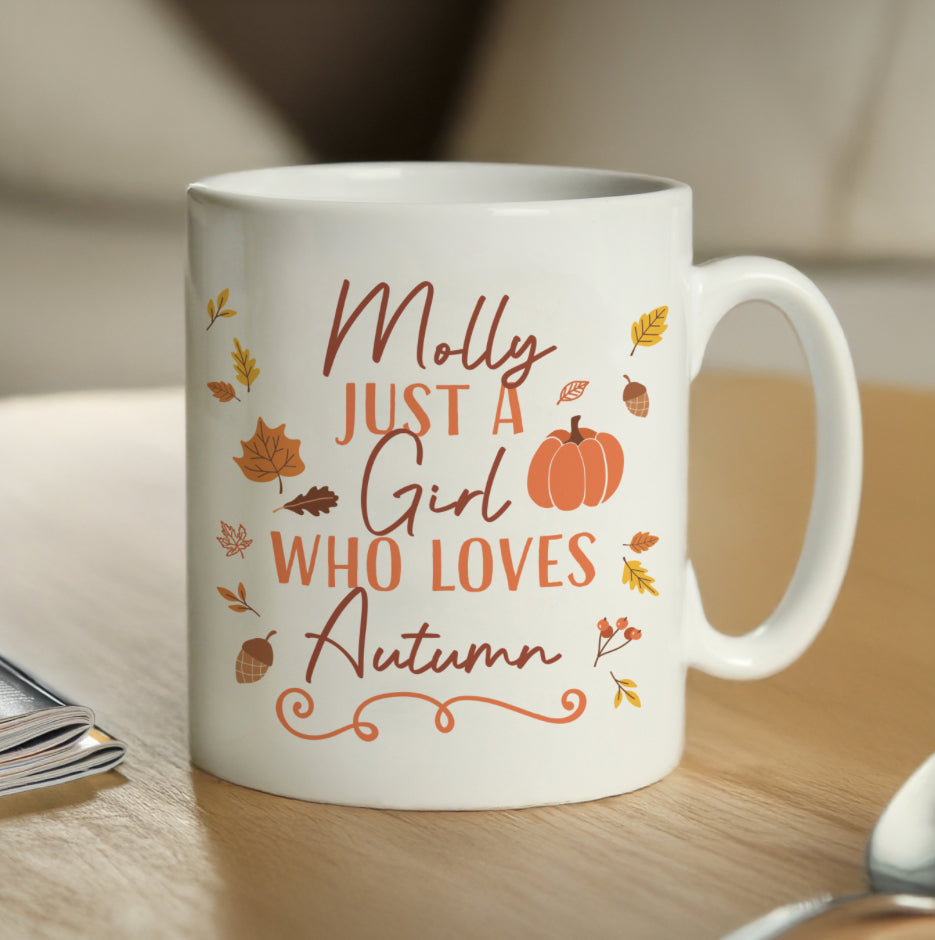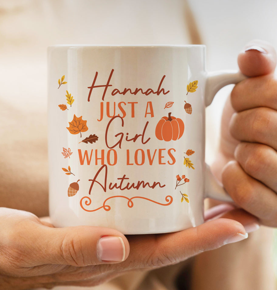 Sip your favourite autumn drink in style with our charming 11oz ceramic mug, featuring the heartfelt phrase 'Just a Girl Who Loves Autumn.'.