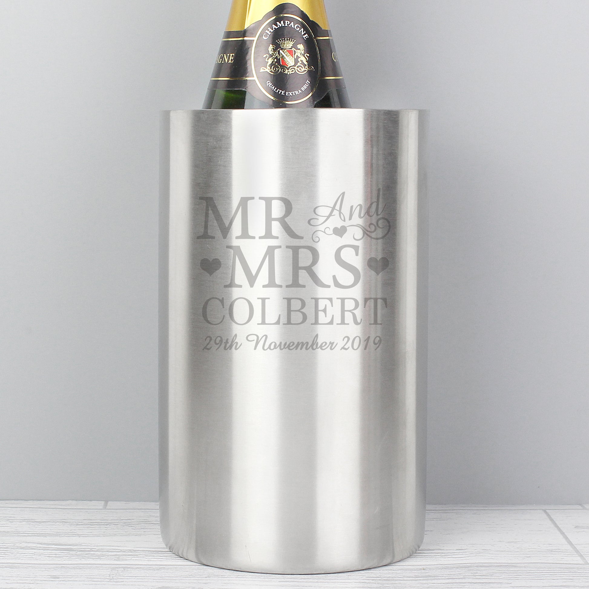 Personalise this Mr & Mrs Stainless Steel Wine Cooler with a surname up to 15 characters and date up to 20 characters.