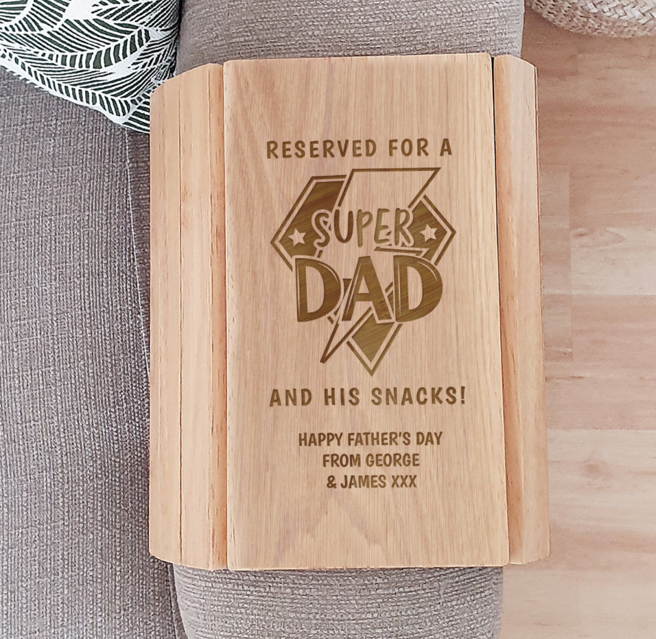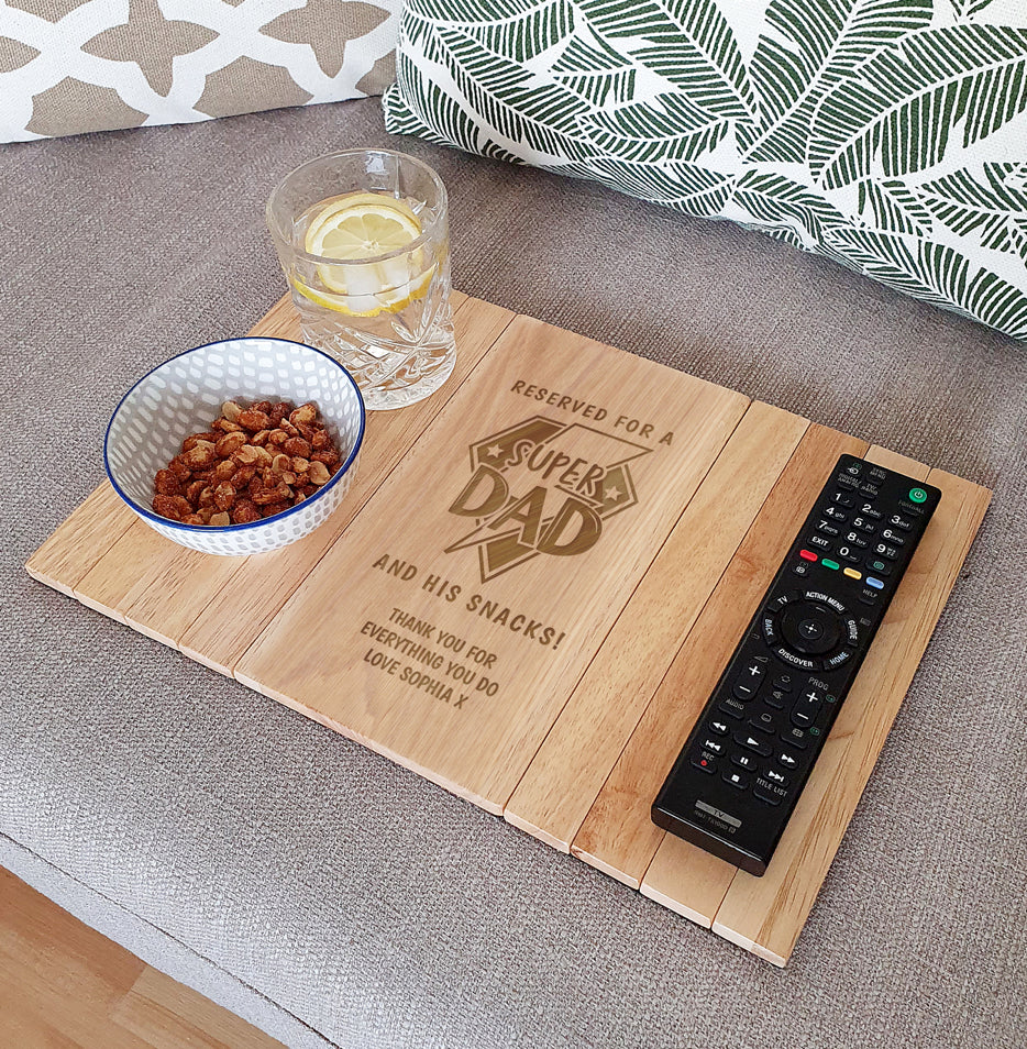Treat the "Super Dad" in your life to this personalised wooden sofa tray, designed to rest comfortably over the arm of your sofa.