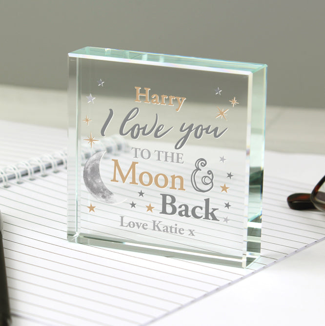 Personalise this adorable 'To the moon and back' glass block with a name up to 12 characters and 1 line of a message below the design up to 20 characters.