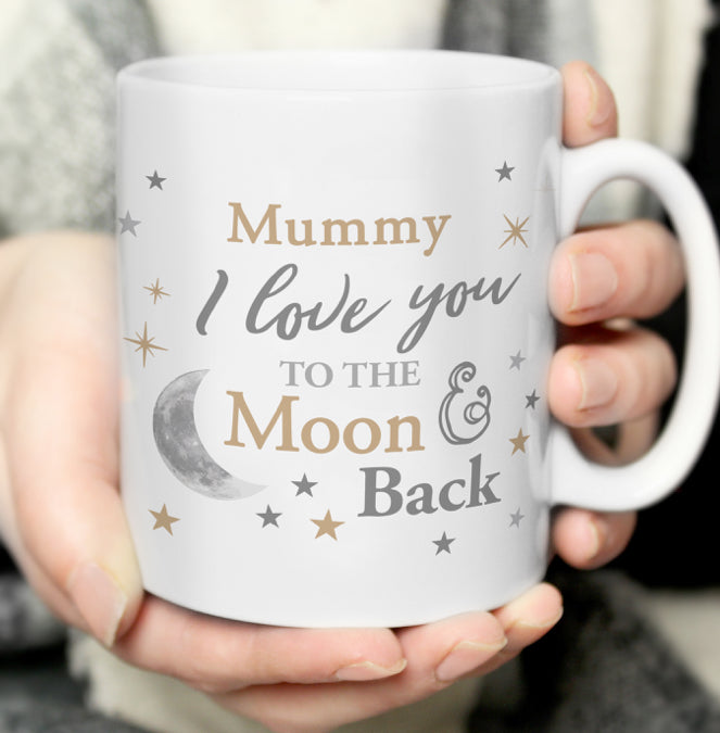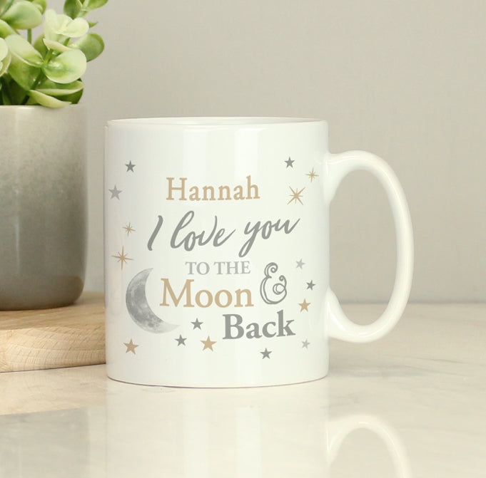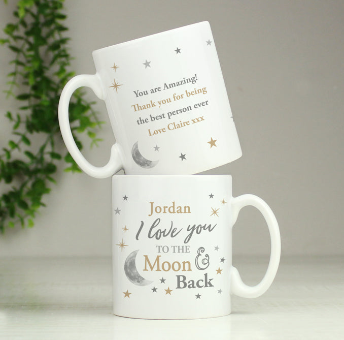 Personalise this charming 'To the moon and back' mug with a name up to 12 characters long to the front and a message over 4 lines of 25 characters on each line to the back.