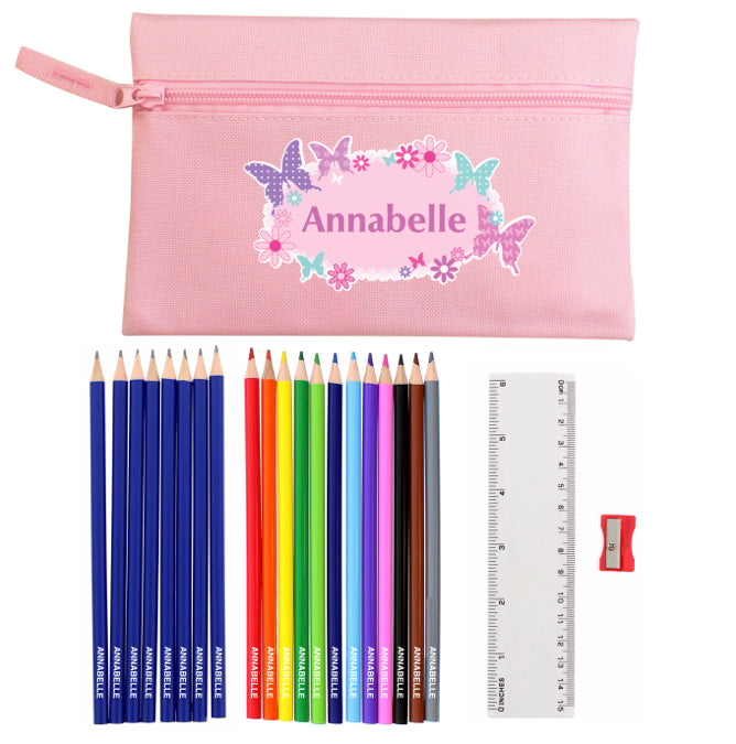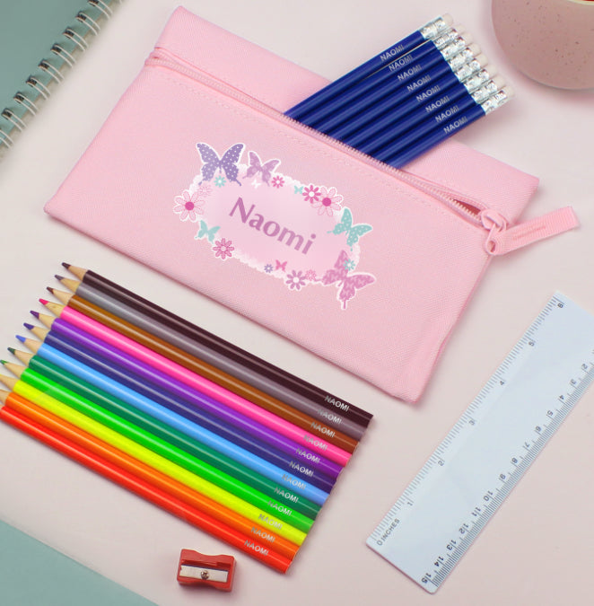 Pink Butterfly Pencil Case with Personalised Pencils & Crayons