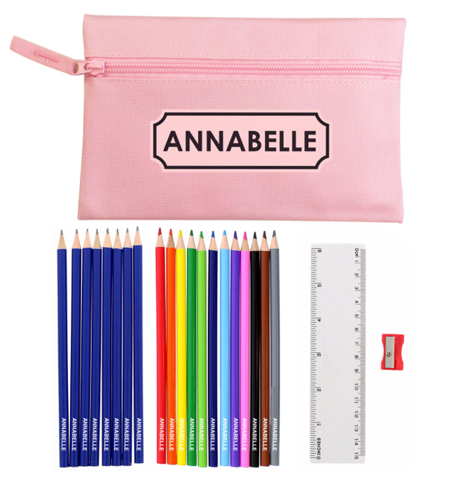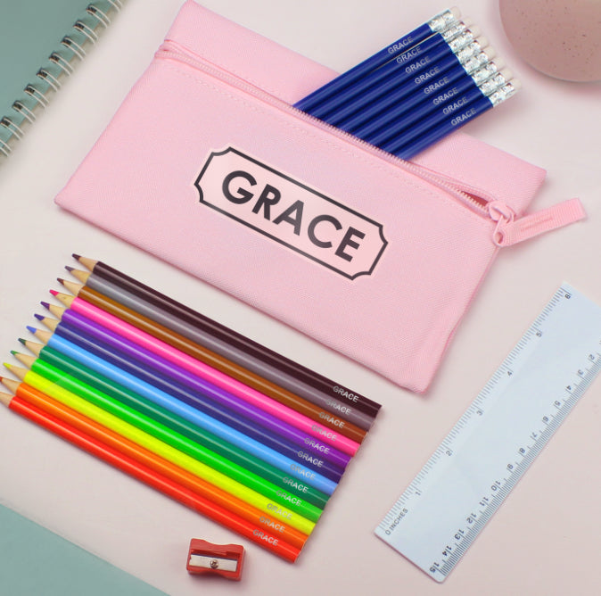 A great gift for school this Pink microfibre pencil case is embroidered with any name up to 15 characters, the pencils & crayons are also personalised with this name.