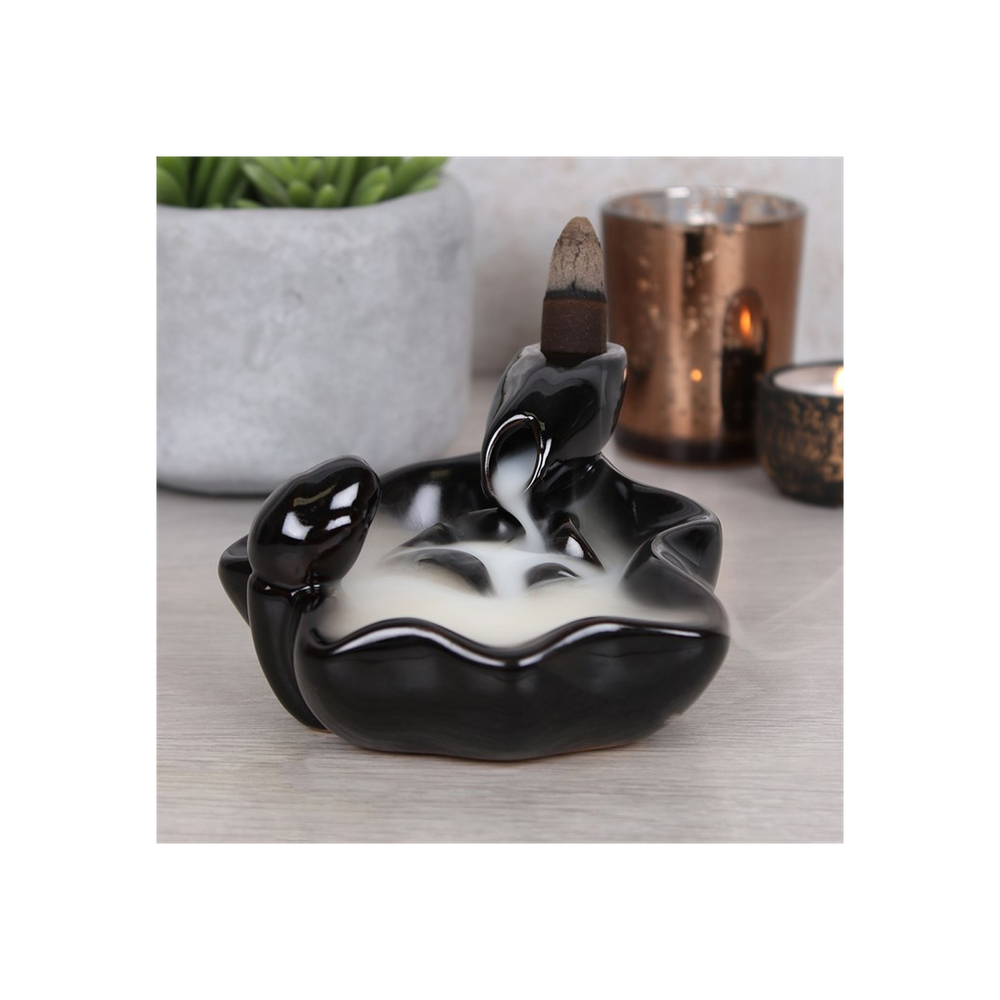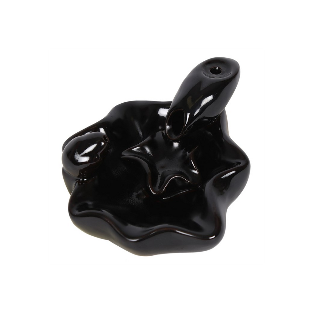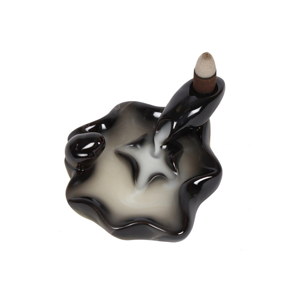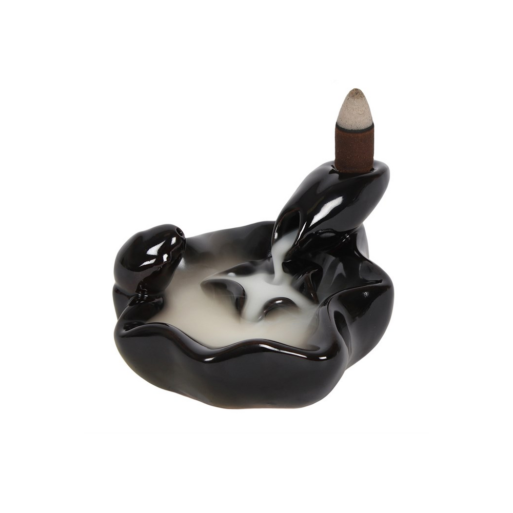 A stunningly simple black ceramic backflow incense burner in a pool to pool design.When the cone is lit the smoke from the cone pours downwards into the small pool then cascades in to the larger pool in a mesmerising waterfall effect. Beautiful to watch. For best effects burn indoors in an area away from any sudden air movements. Please note that after burning it is normal for a light oily residue to appear on the oil burner, for this reason we recommend protecting any furniture it is placed upon suitably. The residue can be easily wiped off the burner with a damp cloth. Please exercise caution when burning incense. Only backflow incense cones should be used with this product ? standard incense cones will not create the desired effect. It is normal for cones to take up to 10 minutes after being lit to start creating the smoking/mist effect. We supply a selection of backflow incense cones in a variety of scents. Product Dimensions: H6cm x W11cm x D12cm Packaged Dimensions: H8cm x W13cm x D8.5cm