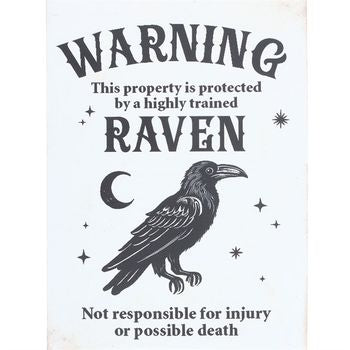 Warn your guests with this metal hanging sign declaring “Protected by a Raven,” complete with gothic raven and moon imagery. An ideal addition to gothic entryways or a quirky gift for fans of dark humour.