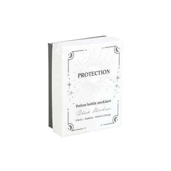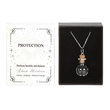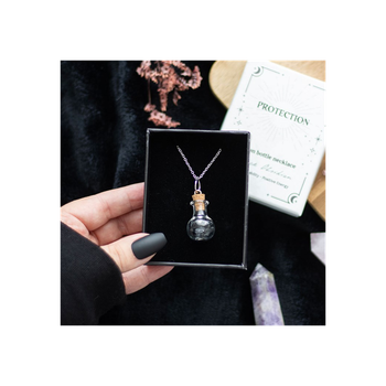 Give the gift of crystal magic with this miniature potion bottle necklace. With natural black obsidian chips and a cork stopper, this necklace serves as a spellbinding accessory while repelling negative energies and promoting stability. Presented in a matching gift box and perfect for that special witch in your life.