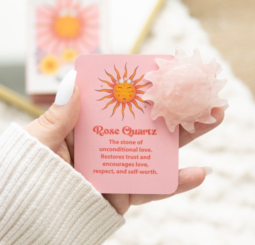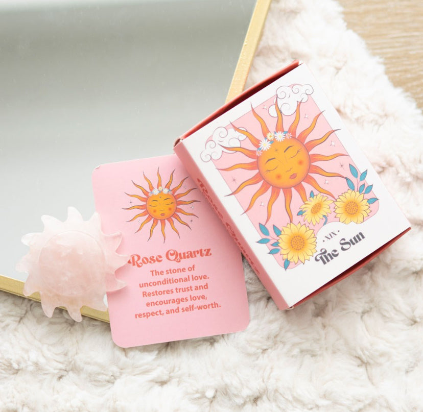 This carved rose quartz crystal sun acts a token of love and self-care, making it a heartfelt gift or a personal treat for teens and adults alike with it's stunning tarot card-inspired design. Known as the stone of unconditional love, it's perfect for those who cherish emotional healing and self-worth, and want to add a touch of positive energy to their space.