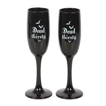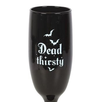 Celebrate with a gothic twist using this set of 2 'Dead Thirsty' champagne flutes. Featuring a sleek black design, they’re perfect for spooky celebrations, weddings, or special occasions with a touch of flair. 300ml.
