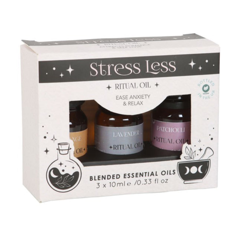 Let the power of these essential oils be the focus of your ritual to stress less. This Set of 3 Stress Less Ritual Blended Essential Oils will create an atmosphere of relaxation, calmness, and blissful serenity.