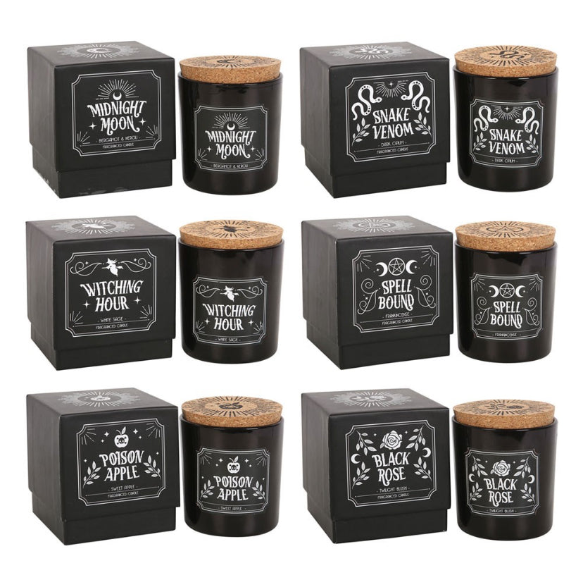 Scents include - Poison Apple (Sweet Apple), Spell Bound (Frankincense), Black Rose (Twilight Rose), Witching Hour (White Sage), Midnight Moon (Bergamot & Neroli) and Snake Venom (Dark Opium).