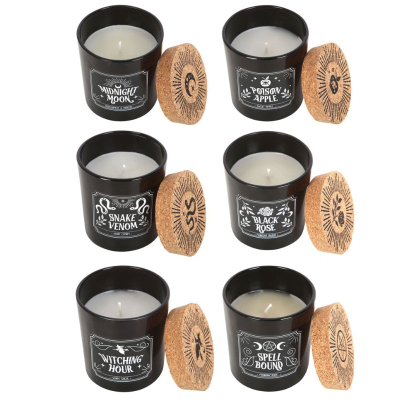 This set includes 6 full-size candles with mystical cork lids in 6 bewitching fragrances.