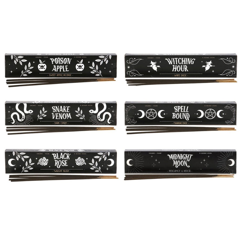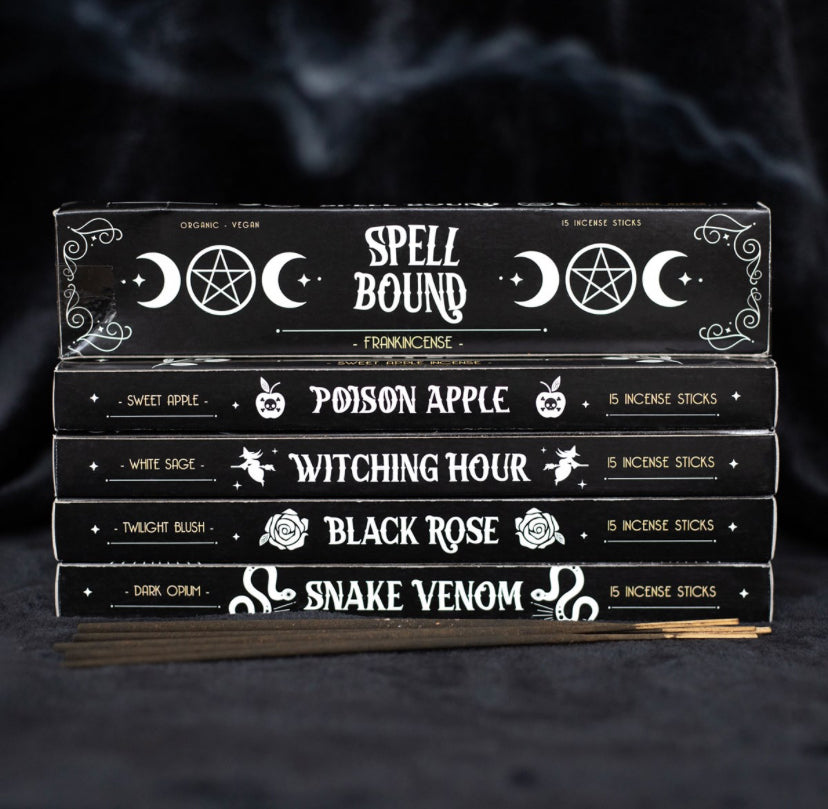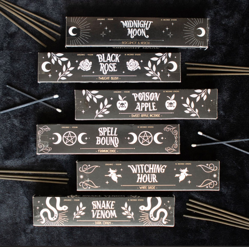 'Poison Apple', 'Spell Bound', 'Black Rose', 'Witching Hour', 'Midnight Moon', and 'Snake Venom'. Each individual pack contains 15 incense sticks, hand rolled in India using the highest quality ingredients and fragrance.