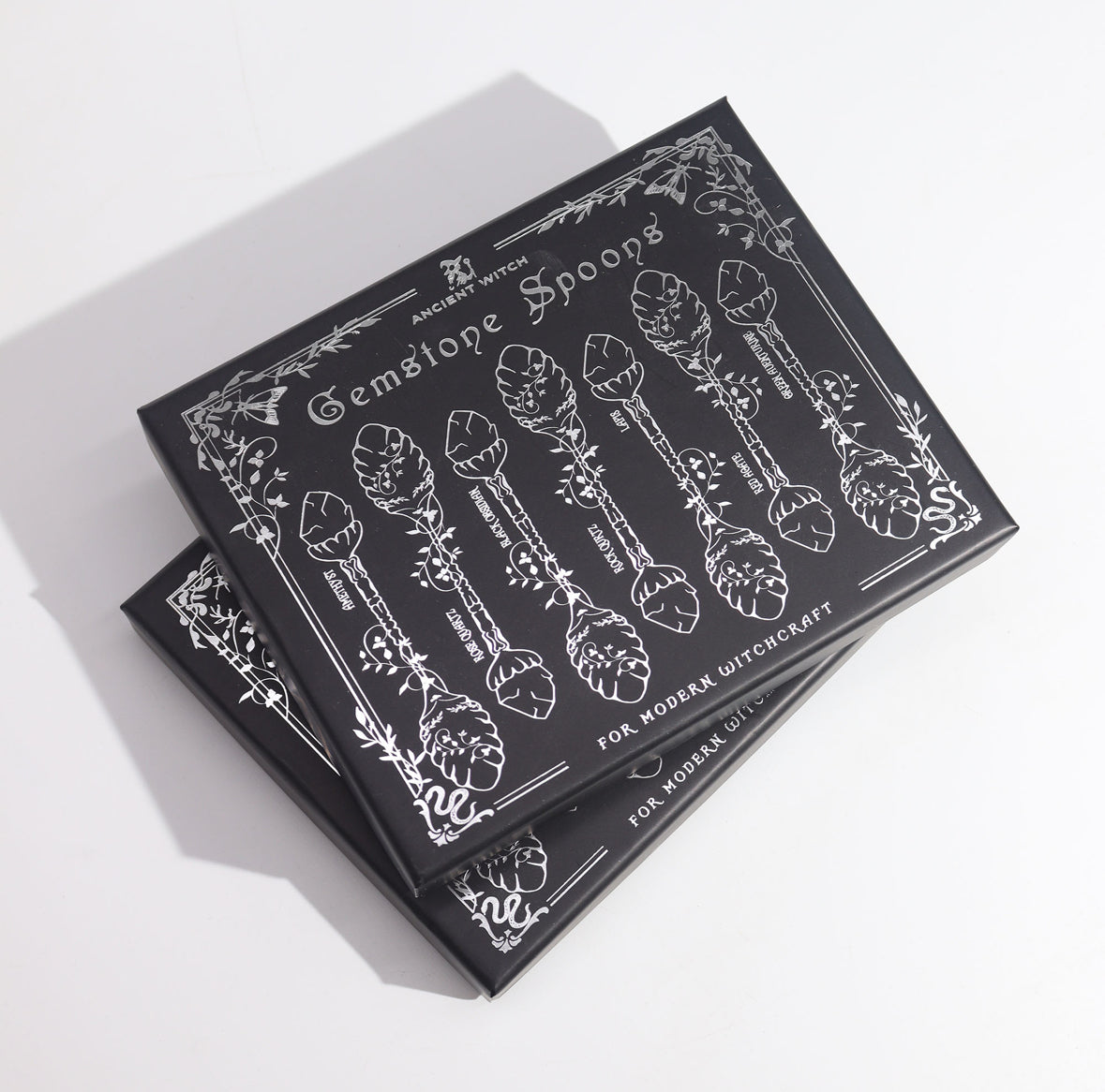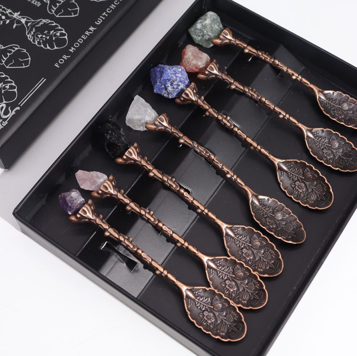 The spoons feature decorative embossed handles and bowls, and are presented in a sleek black gift box (16.5 x 13 cm) with illustrated gemstone names. Whether used as altar tools, spiritual decor, or simply as a thoughtful gift, these spoons are designed to catch the eye and spark curiosity.