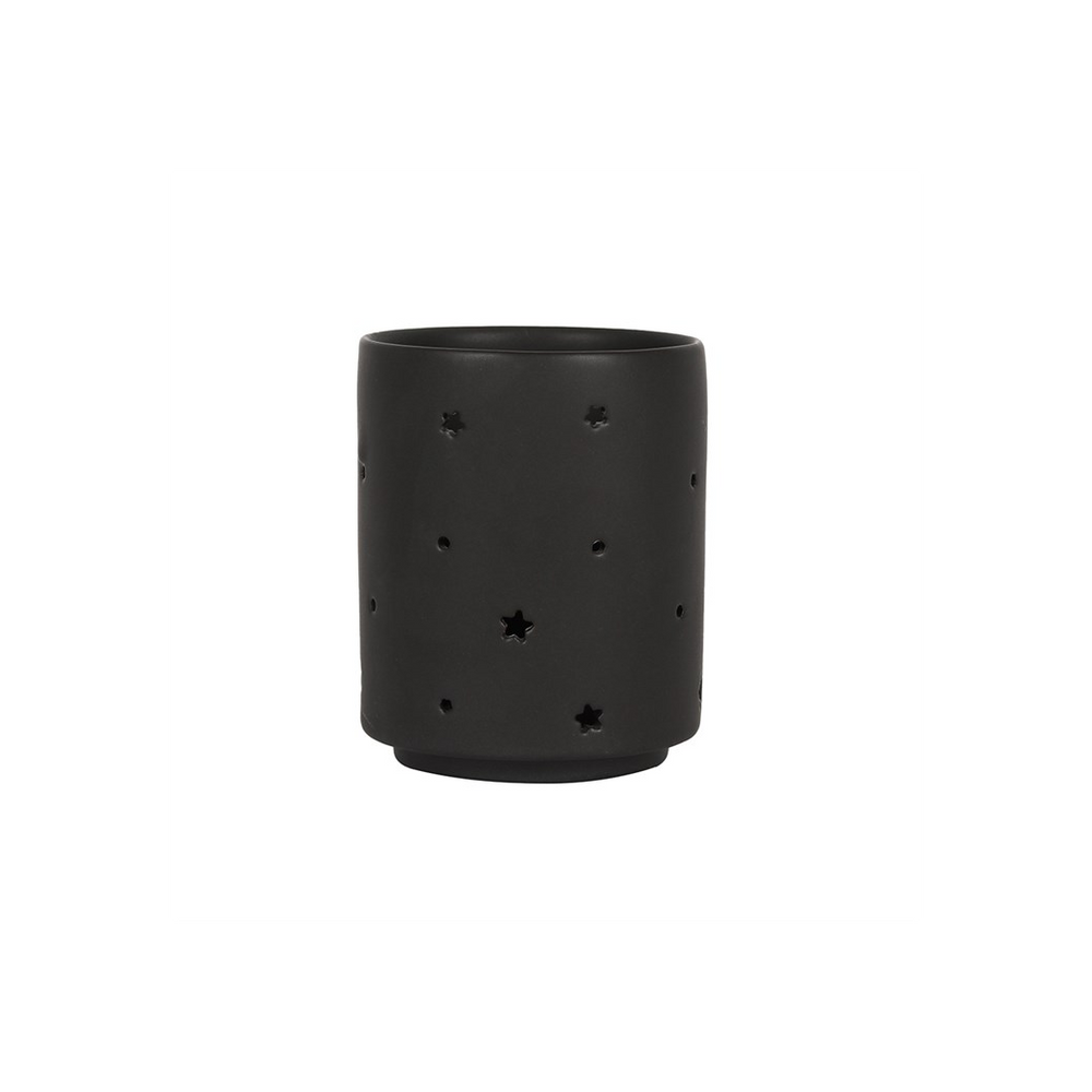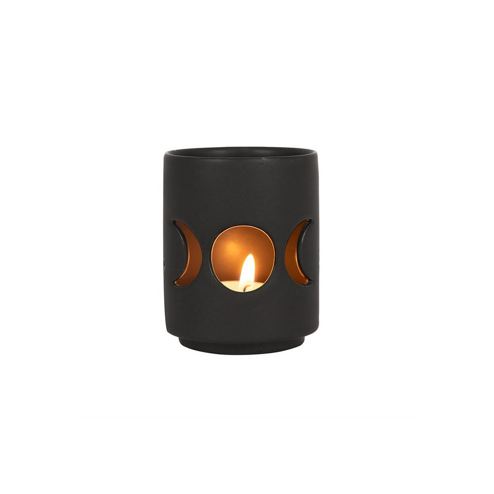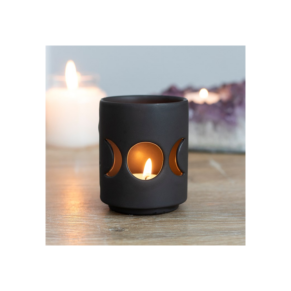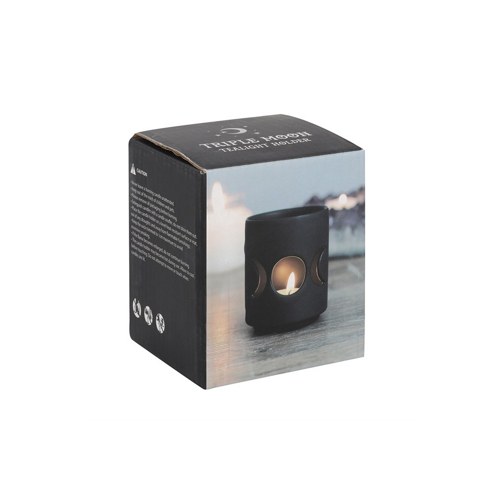 This ceramic tealight holder features a cutout triple moon design in a cool, matt black finish. The triple moon represents the stages of a woman's life; the mother, the maiden, and the crone. Holds one standard tealight candle. Product Dimensions: H7cm x W6cm x D6cm Packaged Dimensions: H9.5cm x W7.5cm x D7.5cm