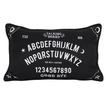 This lovely rectangular fabric cushion is black in colour with a white ouija talking board design. Zip closure so inner can be removed.