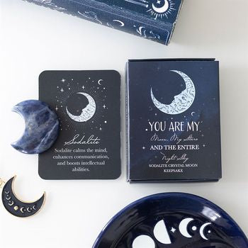 This polished sodalite moon crystal comes nestled in a matching celestial box, making it a thoughtful keepsake for crystal collectors or those drawn to the moon's transforamtive energies.
