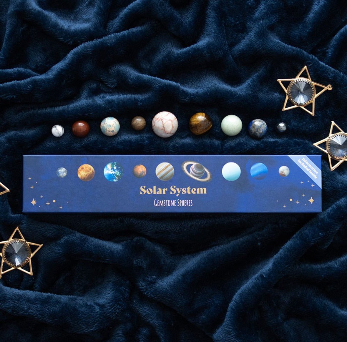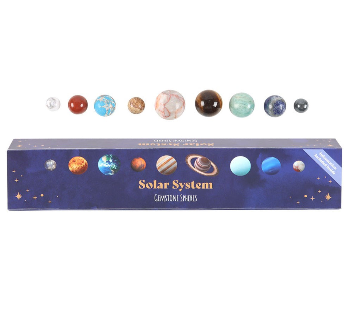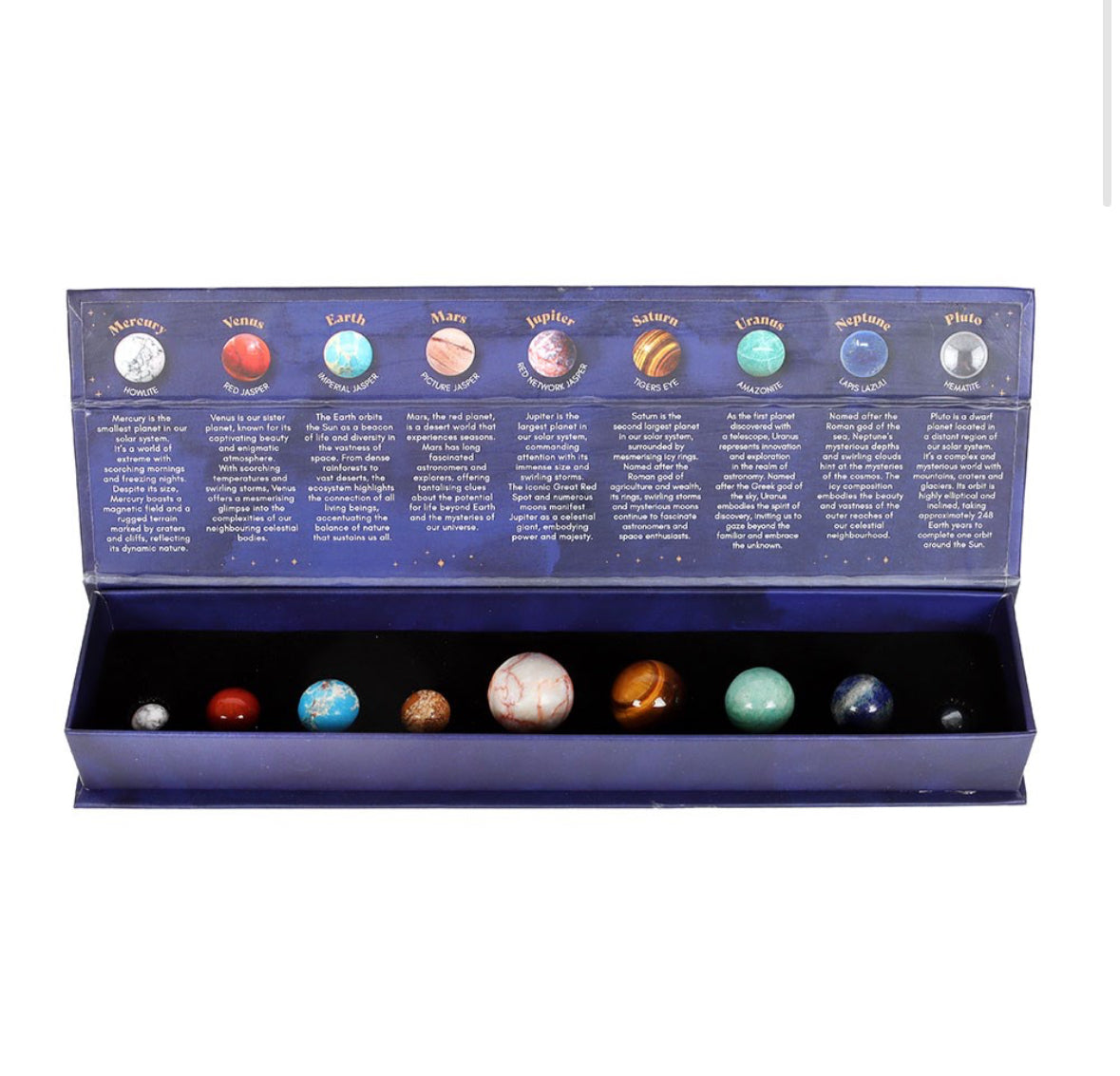 This gemstone sphere set features 9 gemstones that represent a planet from the solar system. Each gemstone is carefully selected and polished to resemble the size, colours and textures of the planets. Crystals in this set include howlite, red jasper, imperial jasper, picture jasper, red network jasper, tiger's eye, amazonite, lapis lazuli and hematite. Beautifully presented in a gift box with information about each planet's meaning inside. As each crystal is unique, stone shape and colour may vary from photos shown.