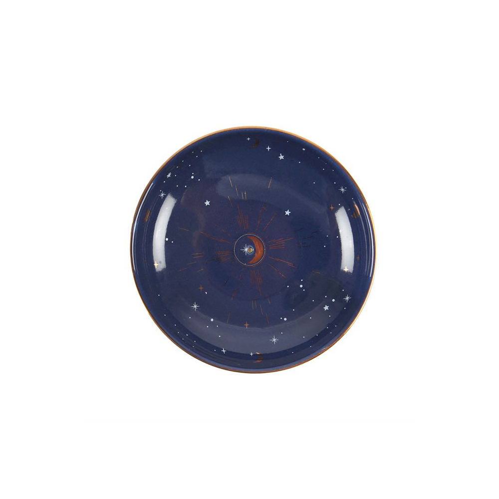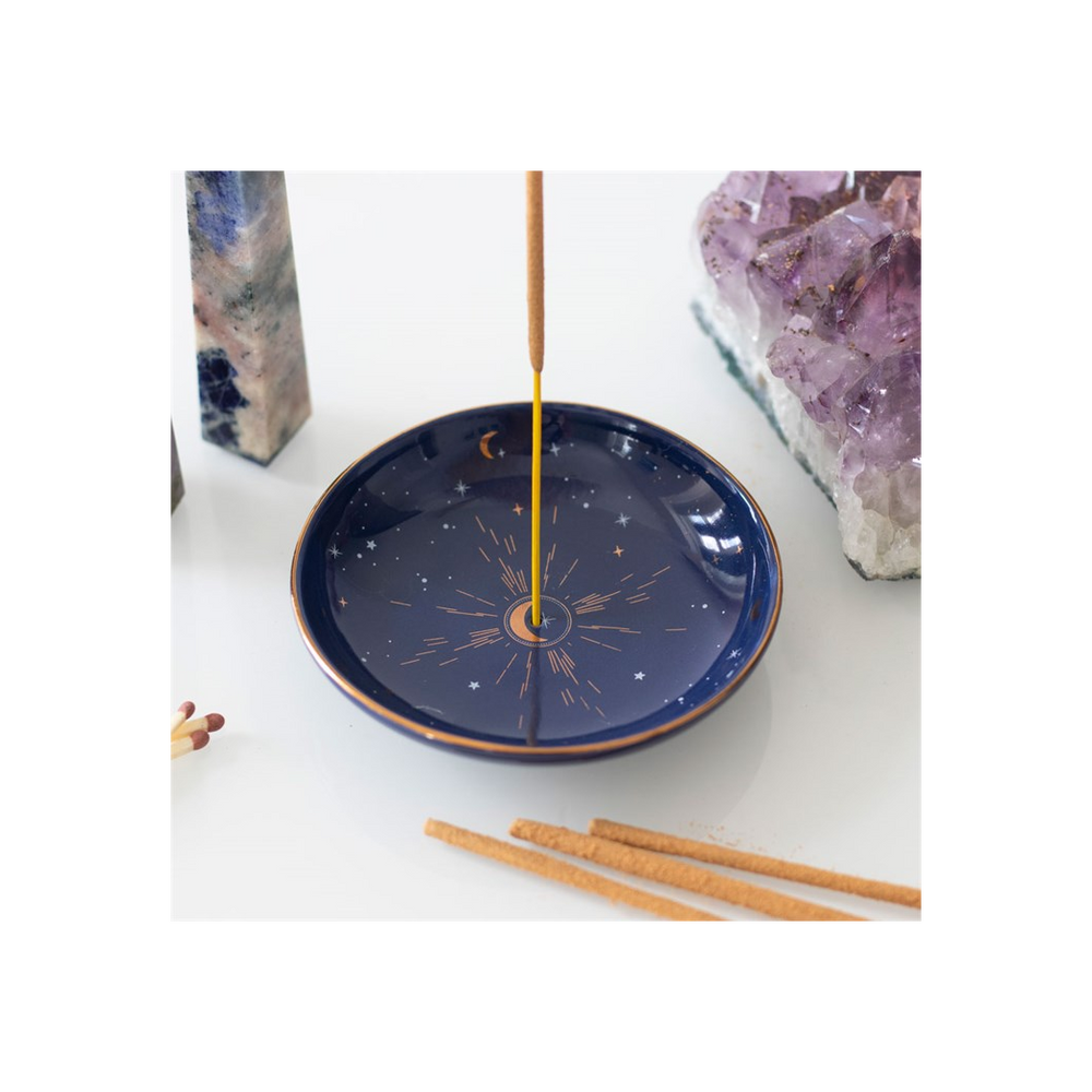 This modern incense stick holder features a starry sky design accented by gold foil details. Simply place a smoking incense stick in the centre of the holder or use to store small trinkets on a vanity or bedside table.Product Dimensions: H2cm x W9cm x D9cm Packaged Dimensions: H2.4cm x W9.5cm x D9.5cm