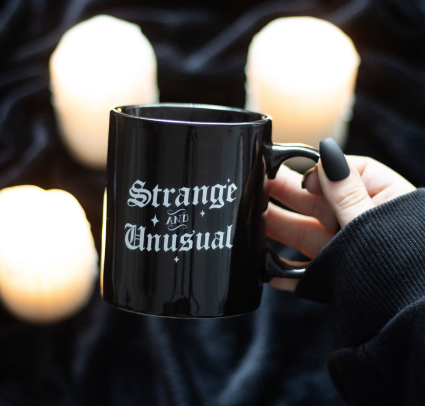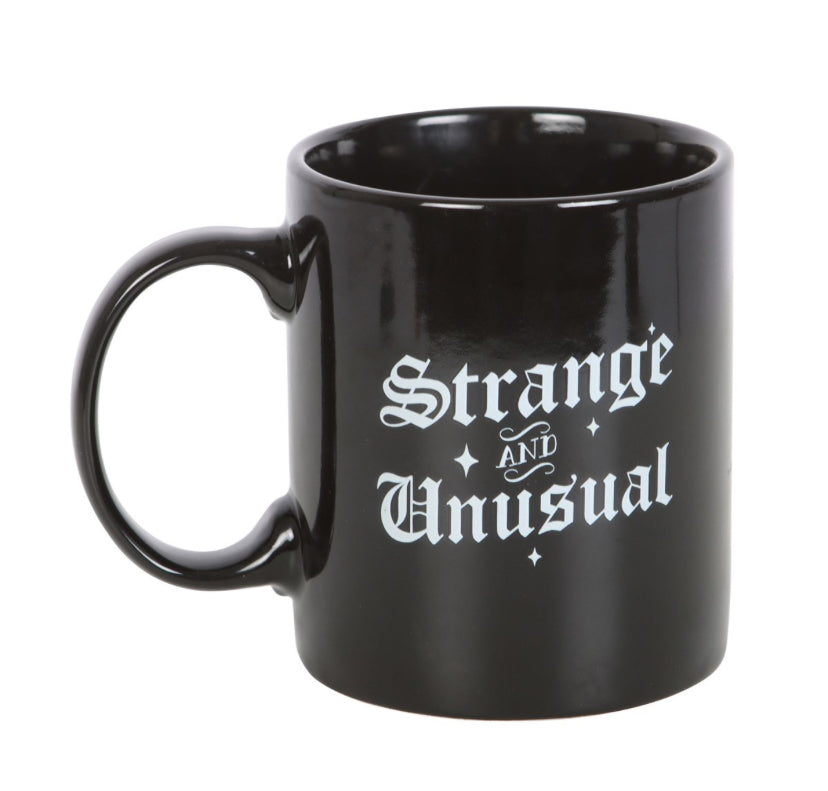 Summon a smile with every sip with this delightfully peculiar ceramic mug. Features 'Strange and Unusual' text written in gothic lettering that's perfect for showing off your dark side.