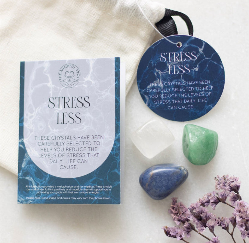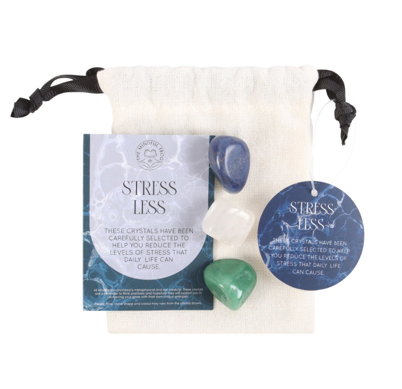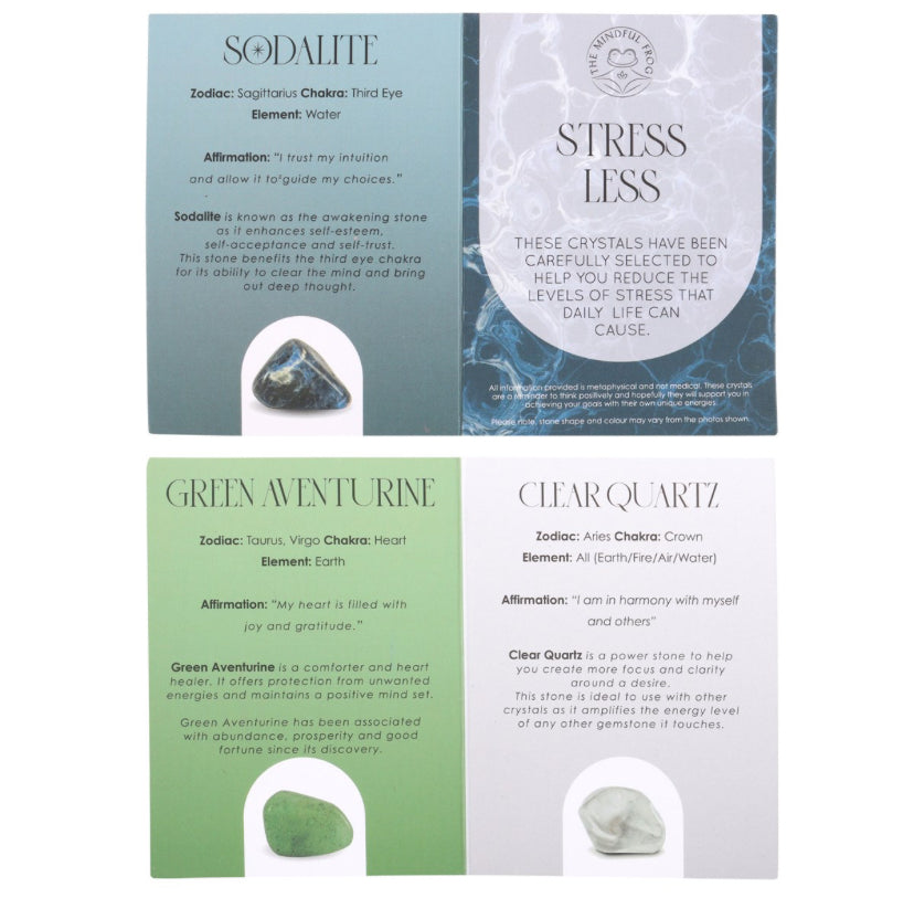 This Stress Less crystal set includes a trio of healing stones selected for their aid in serenity and balance. Green aventurine provides a shield of protection, clear quartz promotes mental clarity and focus and sodalite enhances self-esteem and inner confidence. Presented in a drawstring bag for easy storage and accompanied by an informative insert card, this set of crystals makes a thoughtful and practical gift for anyone seeking peace in their daily life