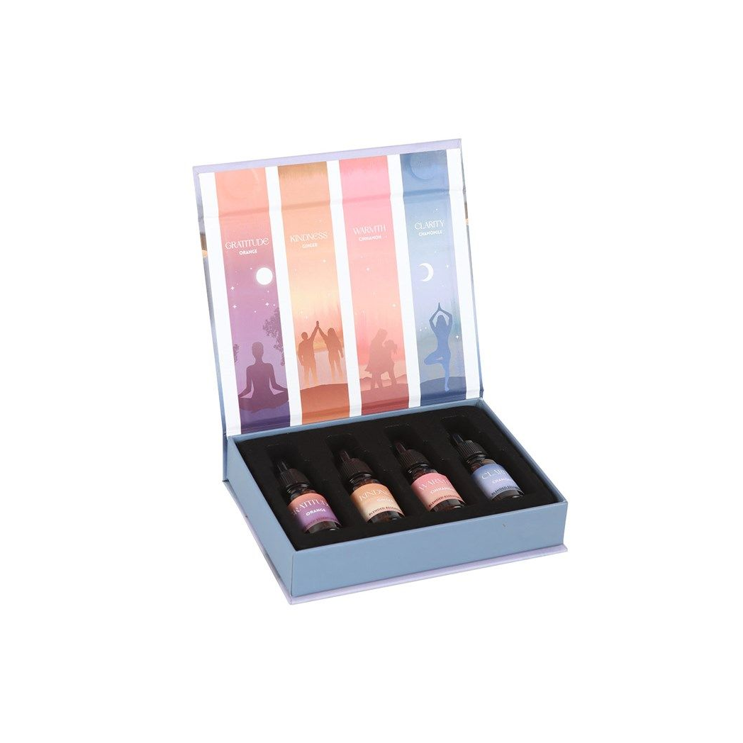 Pause and reset with this Mindfulness collection of ready to use, blended essential oils. The set contains 4 x 10ml bottles with a dropper tool lid, helping to apply just the right amount of oil for each use. The scents you'll discover in this set are: Gratitude - Orange, Kindness - Ginger, Warmth - Cinnamon, Clarity - Chamomile.