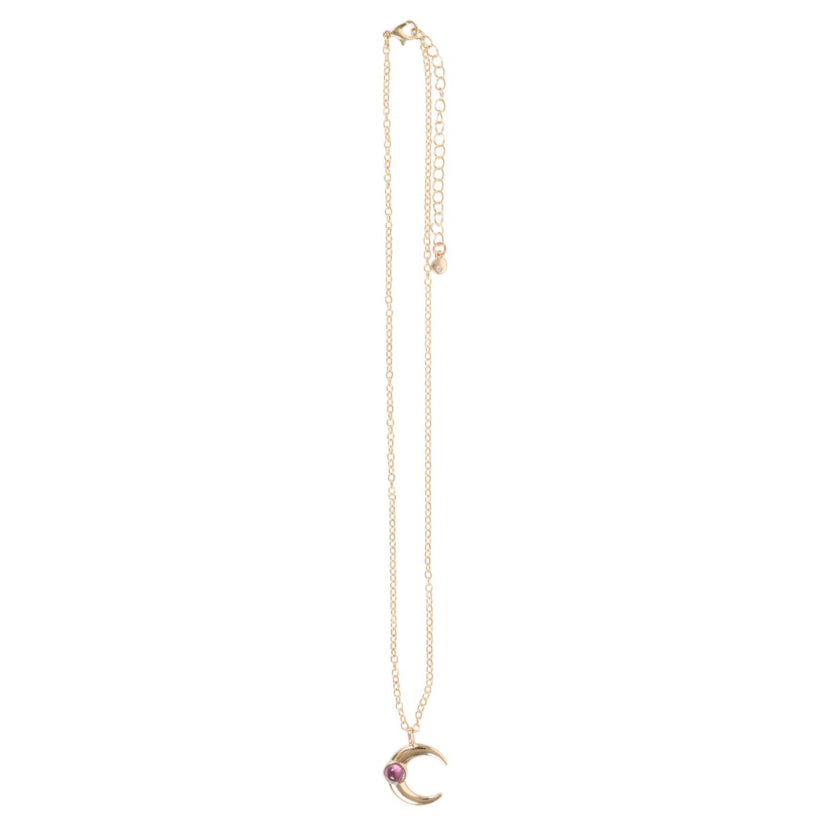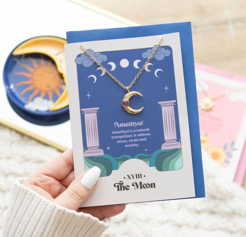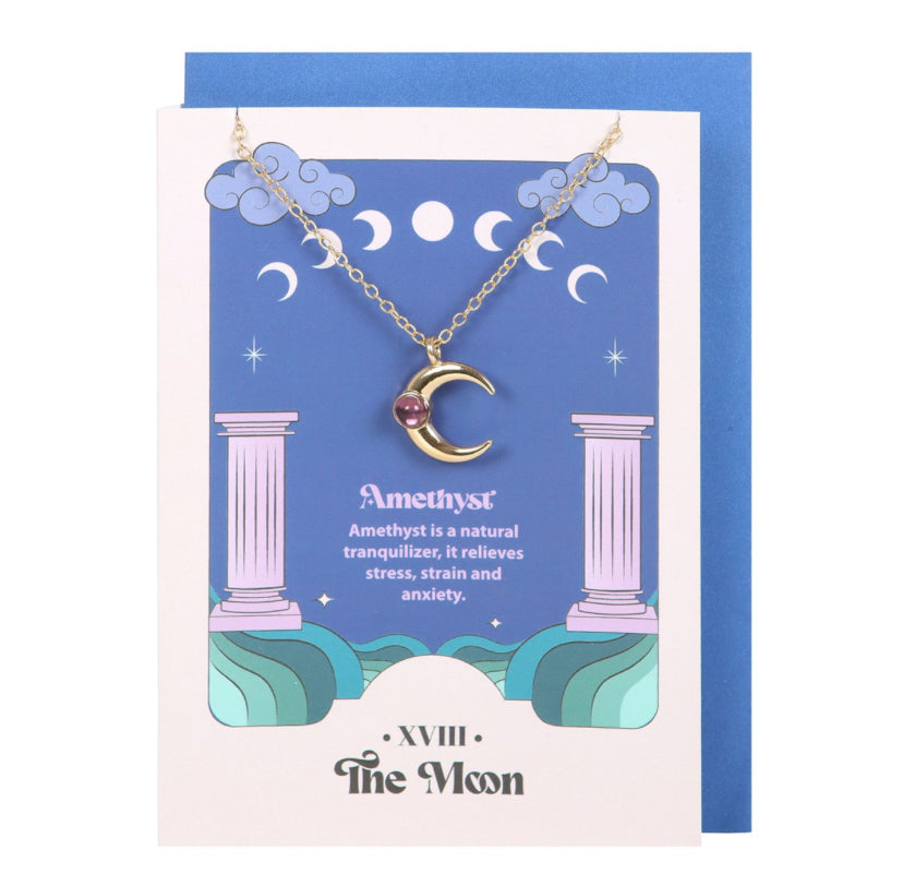 The perfect gift for expressing spiritual growth and inner peace. This stainless steel necklace features a moon pendant with an amethyst crystal. Presented on a colourful greeting card inspired by 'The Moon' tarot card designs, and text describing the benefits of amethyst: "Amethyst is a natural tranquilizer, it relieves stress, strain and anxiety". Blue envelope included for easy gifting.