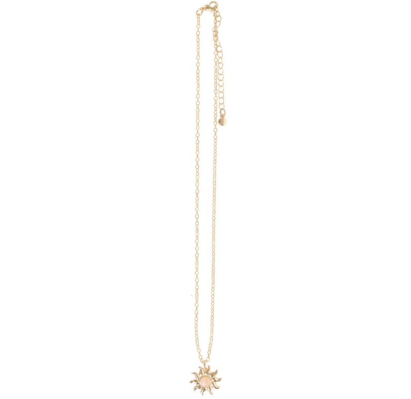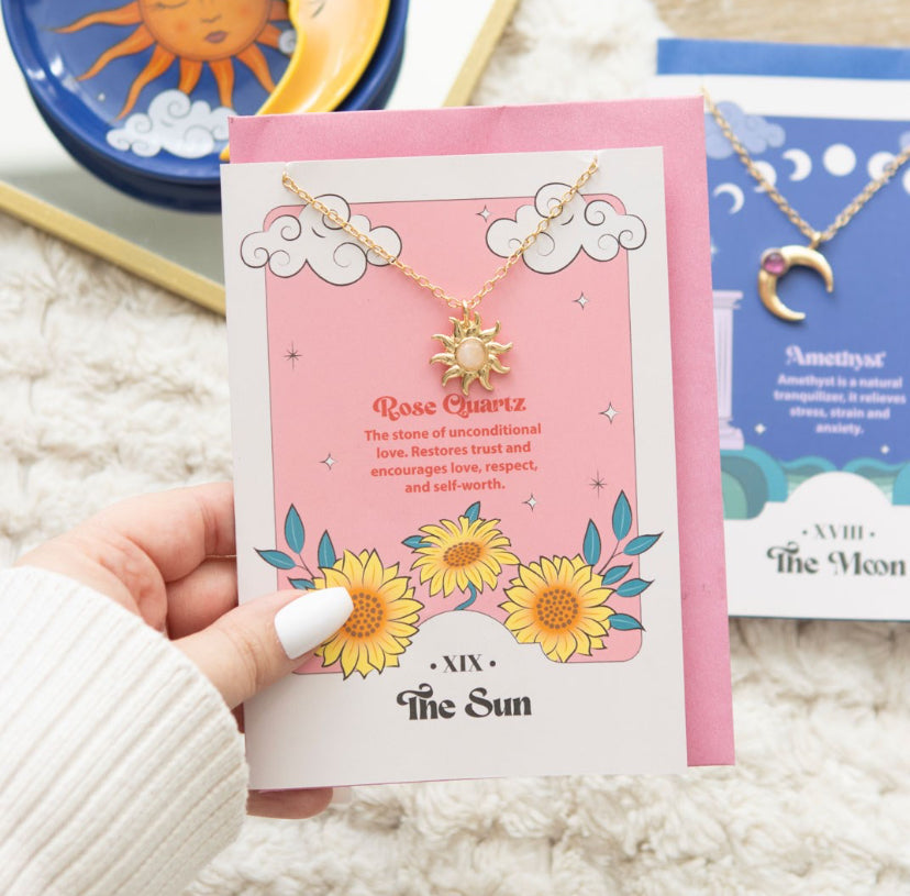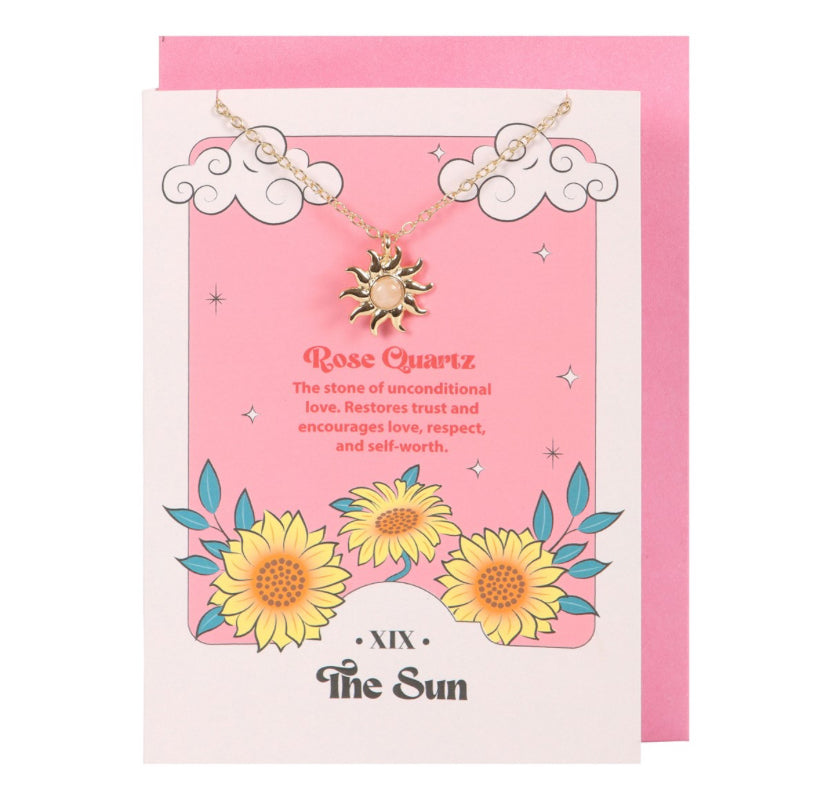 The perfect gift for expressing love and gratitude. This stainless steel necklace features a sun pendant with a rose quartz crystal. Presented on a colourful greeting card inspired by 'The Sun' tarot card designs, and text describing the benefits of rose quartz: "The stone of unconditional love. Restores trust and encourages love, respect and self-worth". Pink envelope included for easy gifting. Designed by Something Different as part of the Celestial Dreams range of divine gifts and home decor.