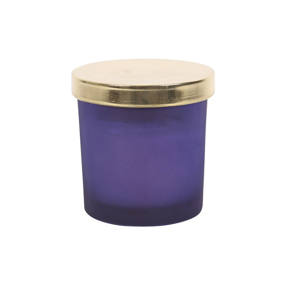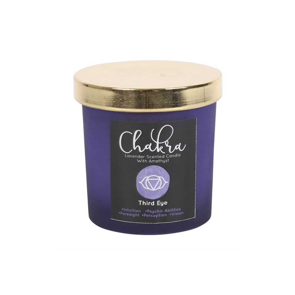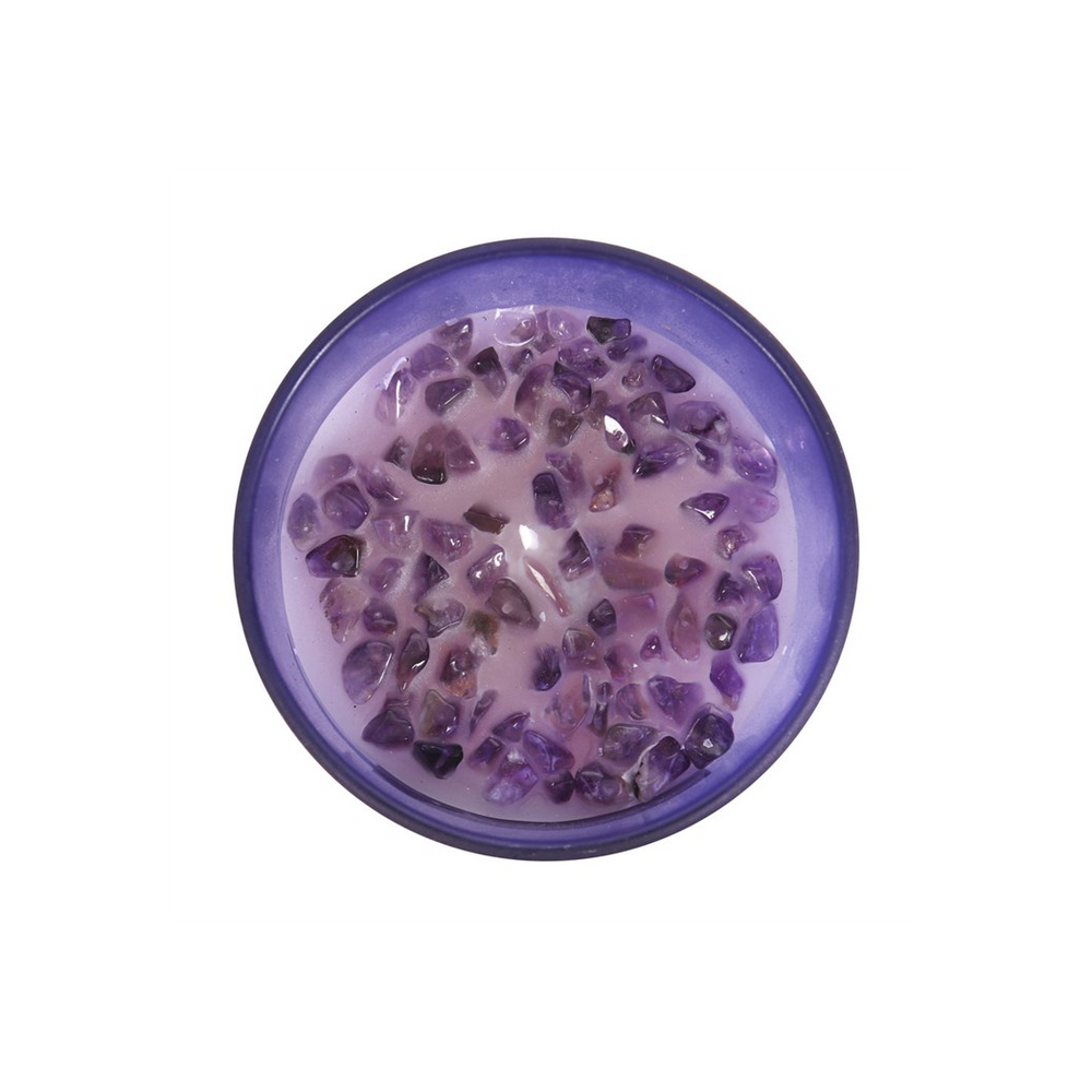 Realign the Third Eye chakra with this stunning Lavender fragranced candle. A purple frosted glass holder and metallic lid are accented by a scattering of amethyst crystal chips that can later be reused for a multitude of spiritual purposes. Paraffin wax. Approximate burn time of 25 hours. Please practice caution when burning and never leave lit candle unattended.