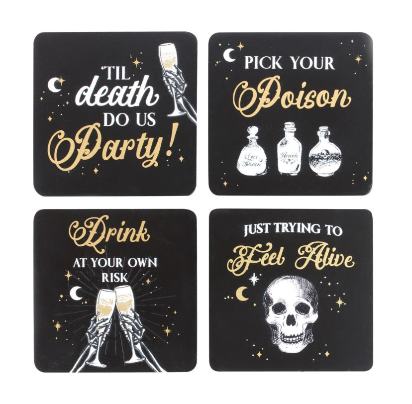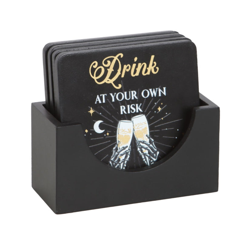 Perfect for those with a taste for the macabre, these coasters blend elegant design with playful, witty phrases, adding a unique charm to your entertaining space