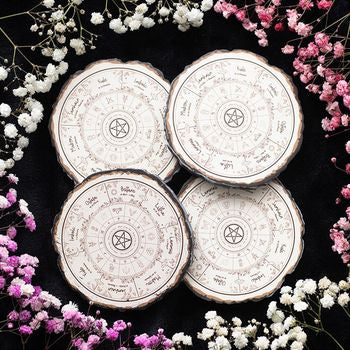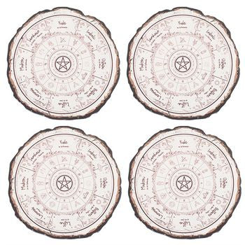 Protect surfaces with a touch of seasonal wisdom using this set of four coasters, each featuring a wood slice effect and a Wheel of the Year design.