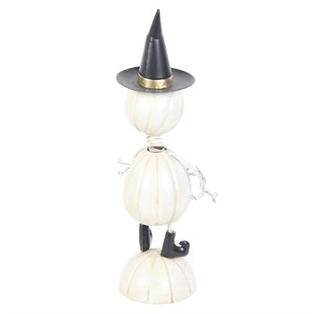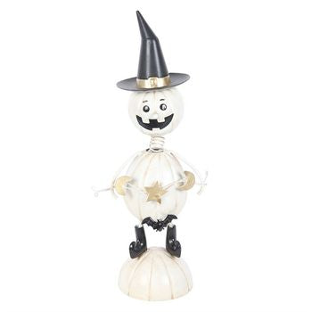 Add a ghostly twist to your seasonal décor with this white pumpkin man ornament, complete with a tall witches’ hat and playful wire arms. Perfect for Halloween displays or autumn-inspired arrangements, this metal decoration brings a touch of spooky fun to any setting.