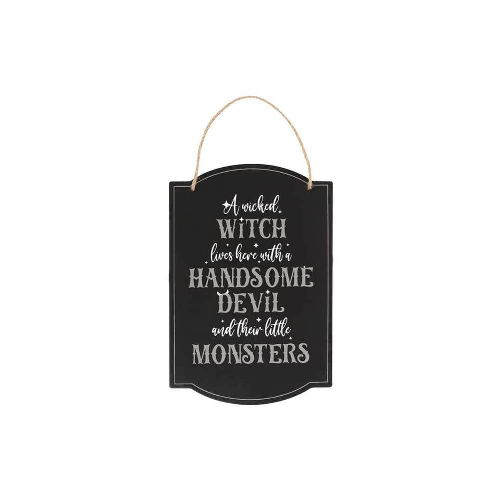 This quirky hanging sign is the perfect way to decorate for a spooktacular Halloween with fun 'A Wicked Witch Lives Here with a Handsome Devil and Their Little Monsters' text accented with a dash of magic. Perfect for a door or entryway, this sign is a must-have for any family of ghouls.