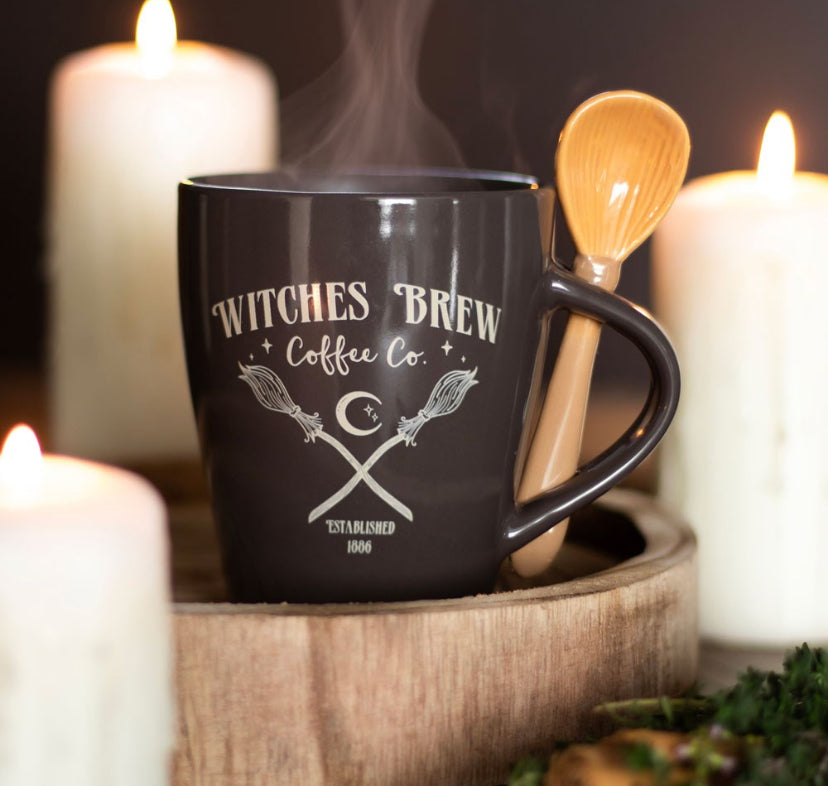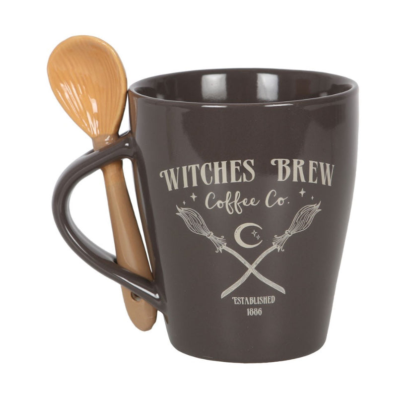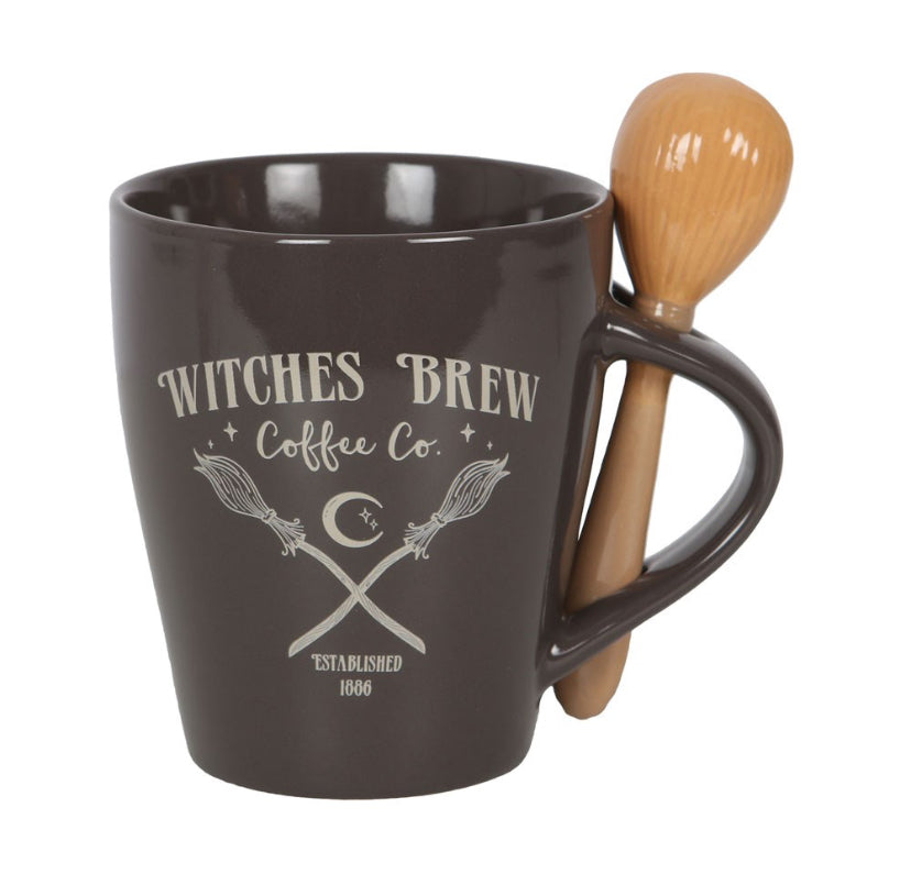 Get your morning off to a running start with this bewitching witches brew mug with matching broom teaspoon. Features a pair of crossed broomsticks and 'Witches Brew Coffee Co.' text with a slotted handle for holding the spoon. 500ml capacity. Dishwasher and microwave safe.